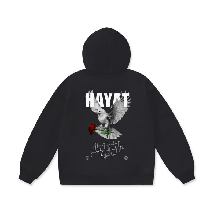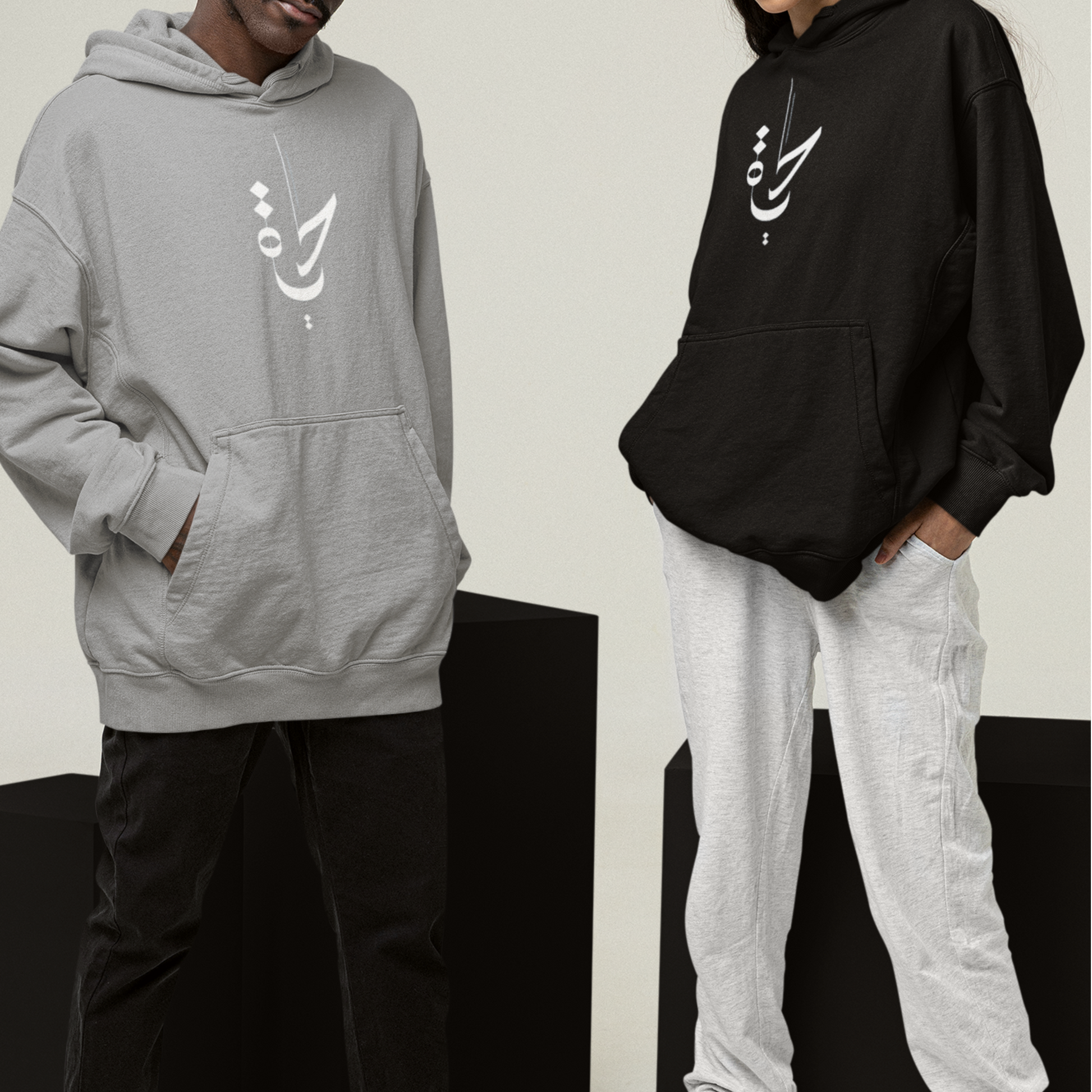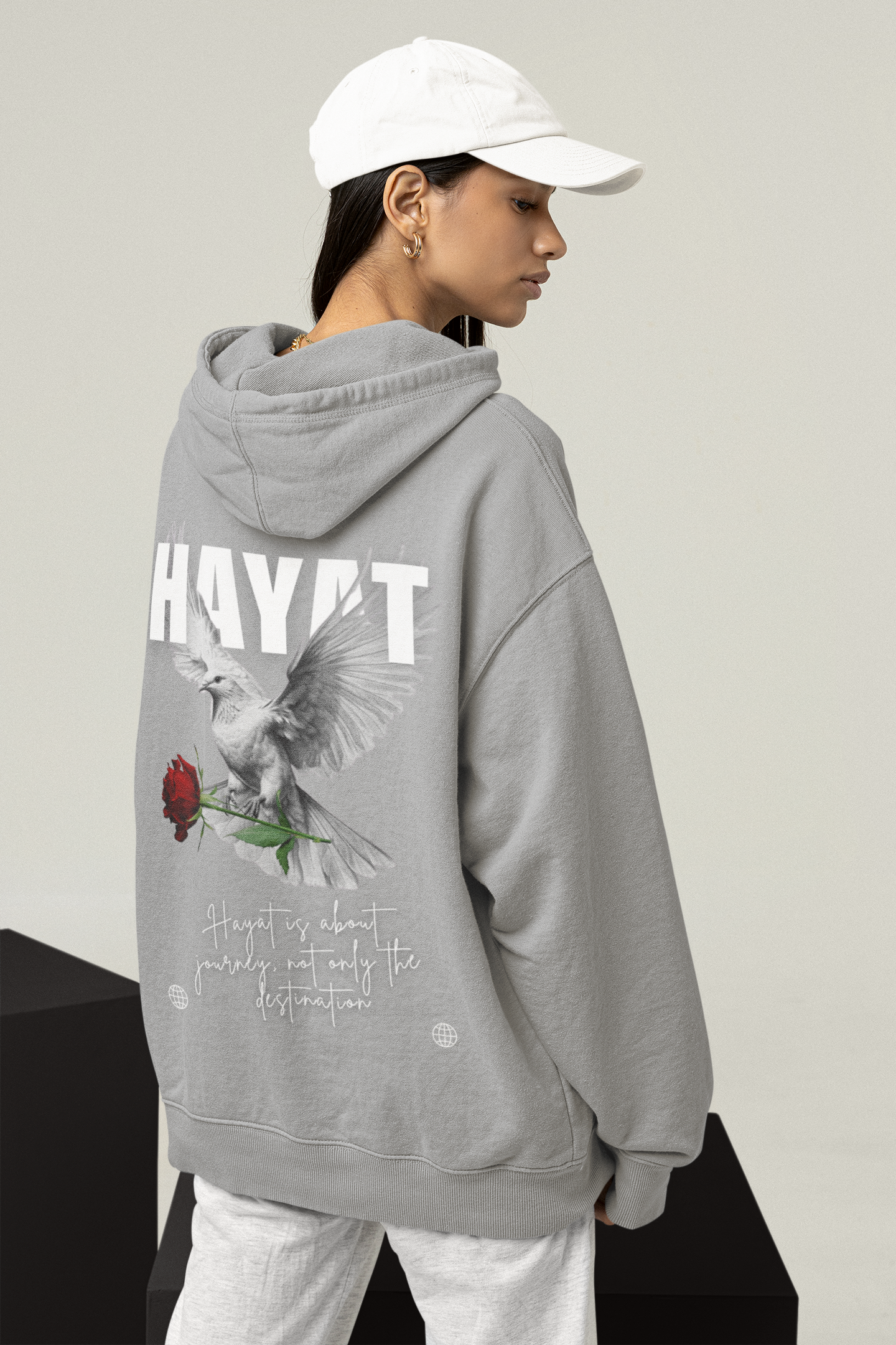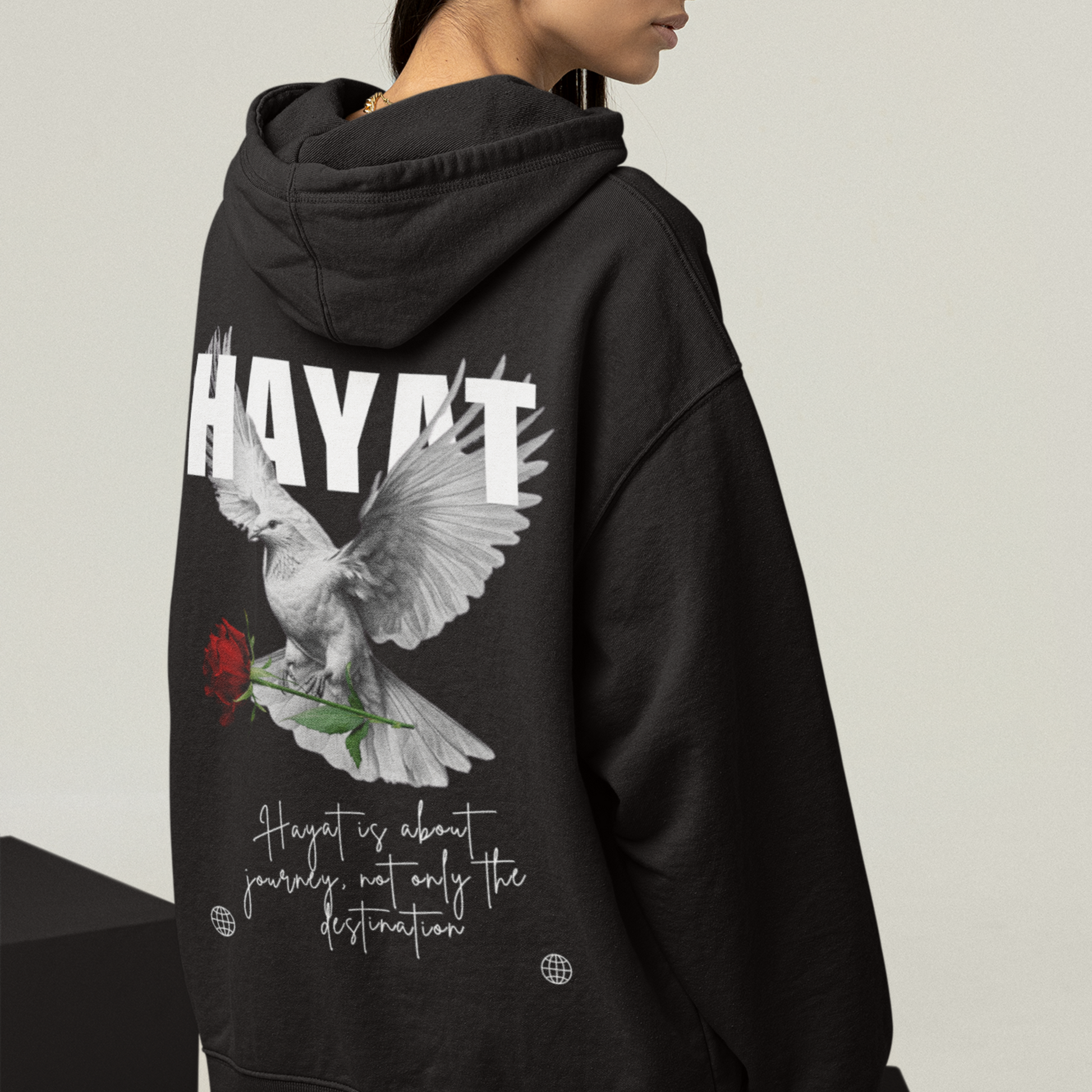 Embrace comfort and style with our oversized hoodie featuring a bold, minimalistic design. The front showcases the Arabic word "حياة" (meaning "life"), symbolizing vitality, resilience, and hope. The back carries the transliteration "Hayat," connecting cultures and adding a unique touch. Made from soft, high-quality fabric, this hoodie offers a relaxed fit, perfect for everyday wear.