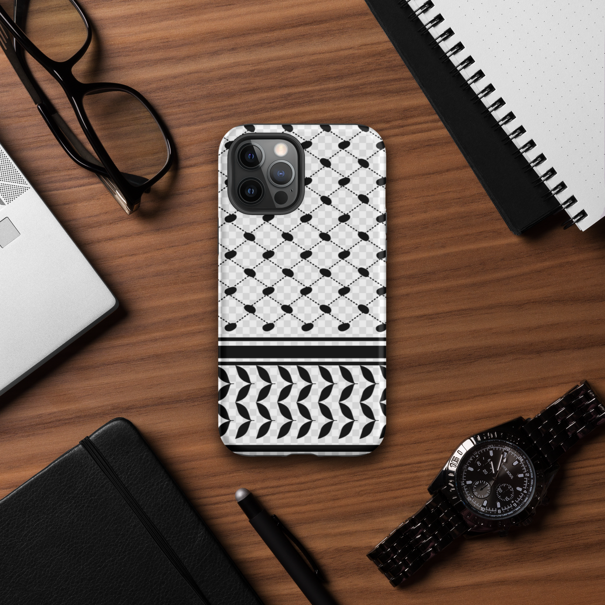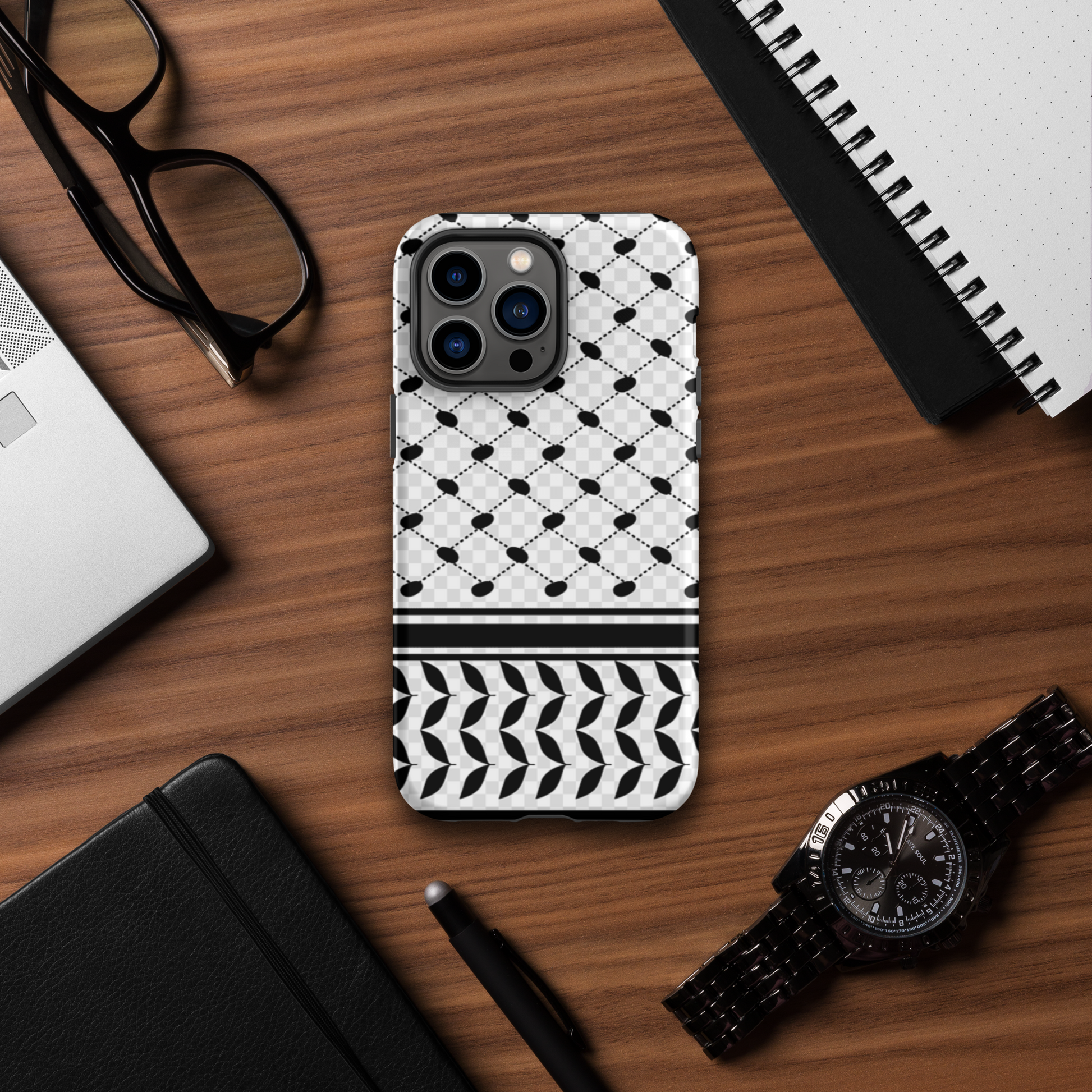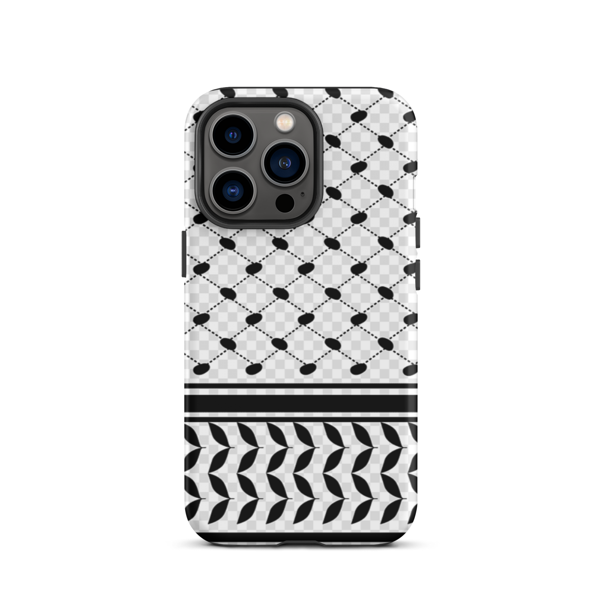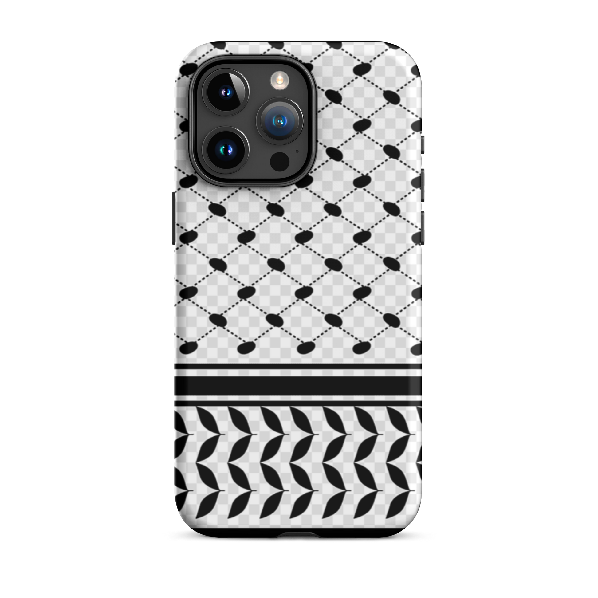 This phone case features a striking design inspired by the traditional Palestinian keffiyeh. The iconic black and white pattern, symbolizing resistance and cultural pride, is intricately woven into the fabric of the case, creating a bold and meaningful statement.