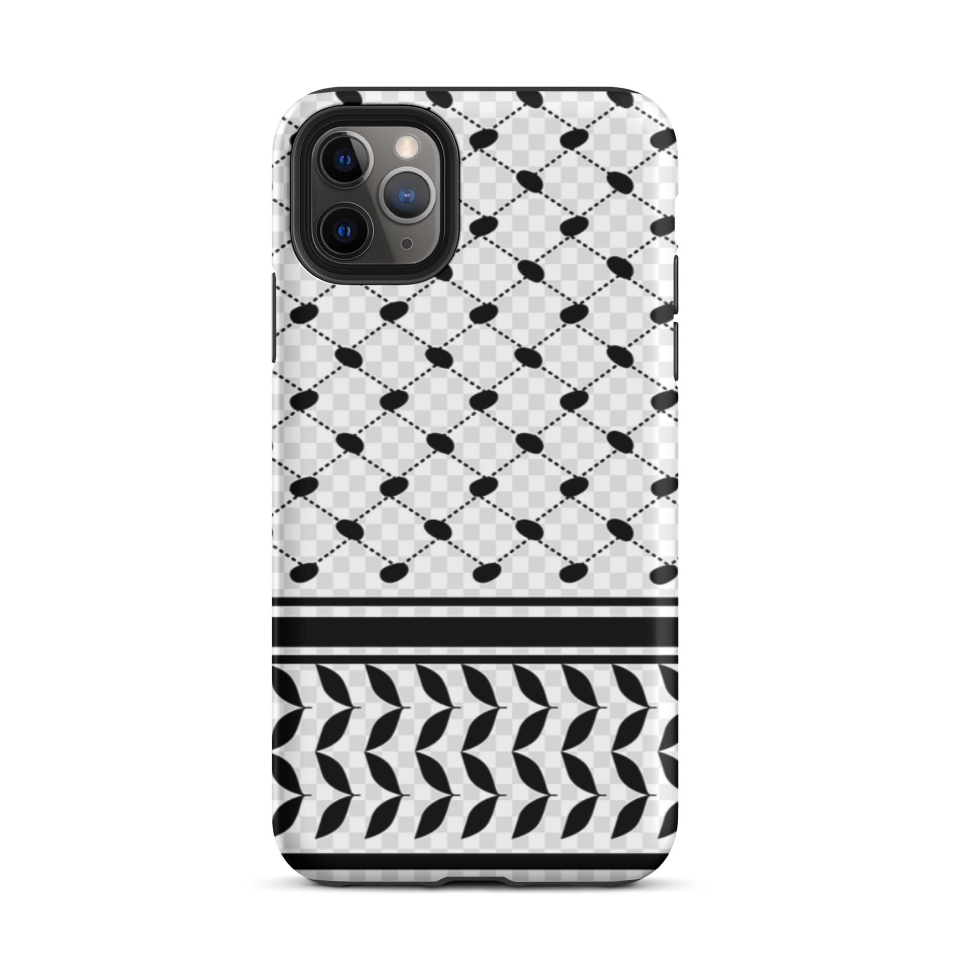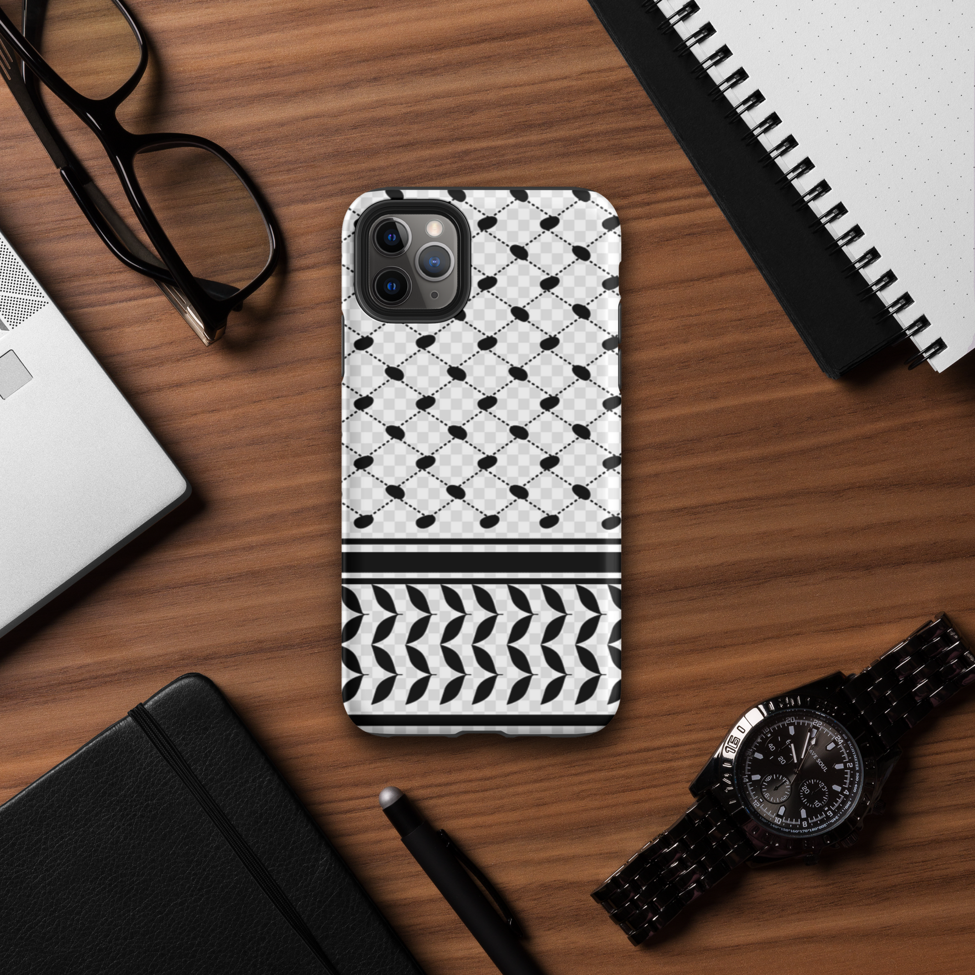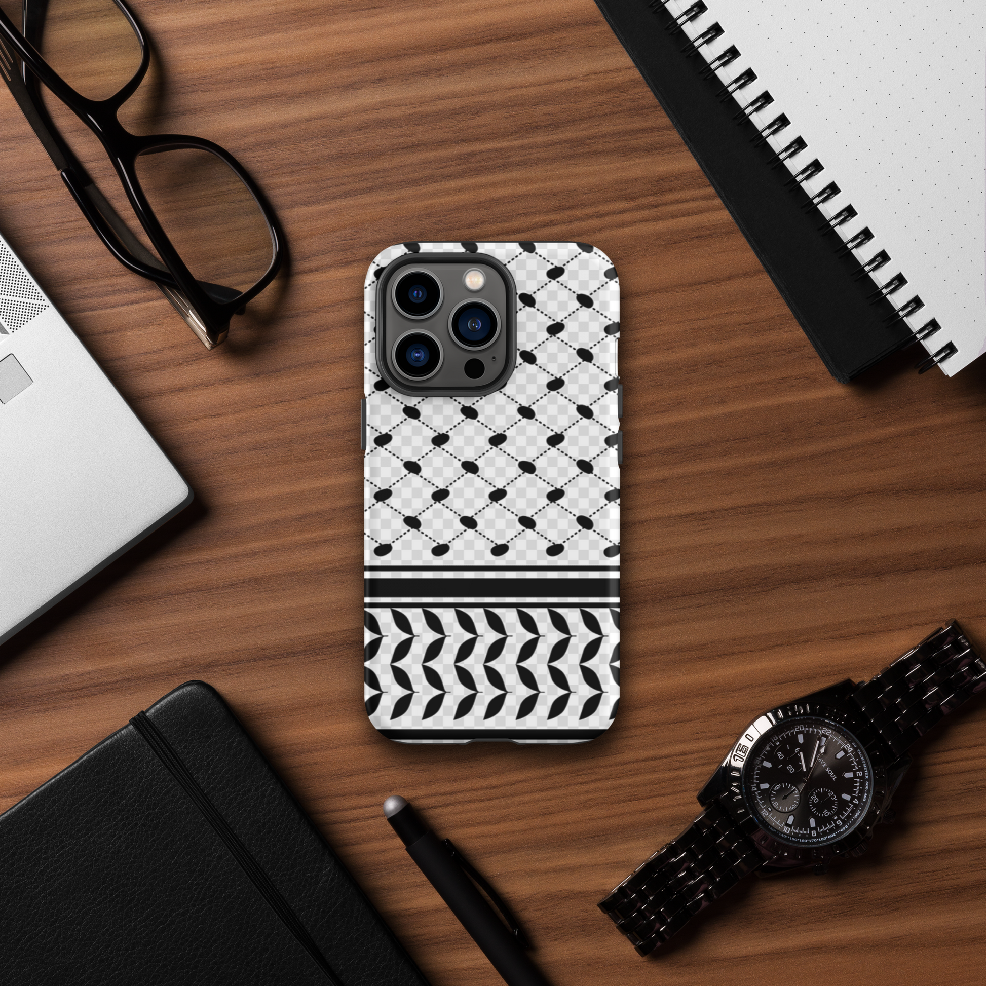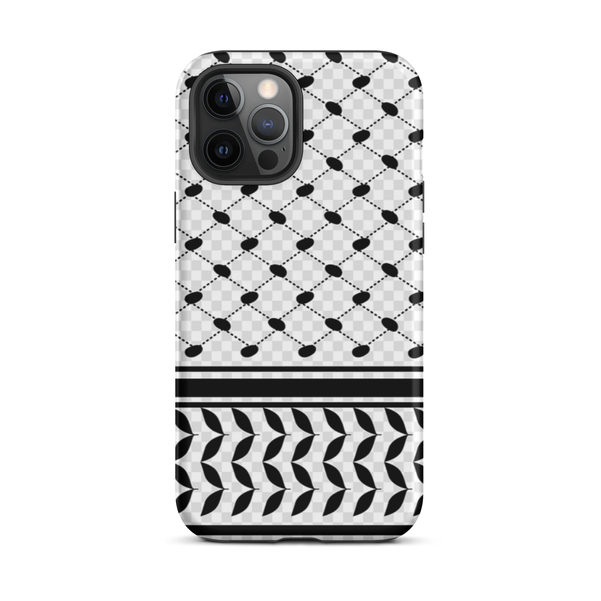 This phone case features a striking design inspired by the traditional Palestinian keffiyeh. The iconic black and white pattern, symbolizing resistance and cultural pride, is intricately woven into the fabric of the case, creating a bold and meaningful statement.
