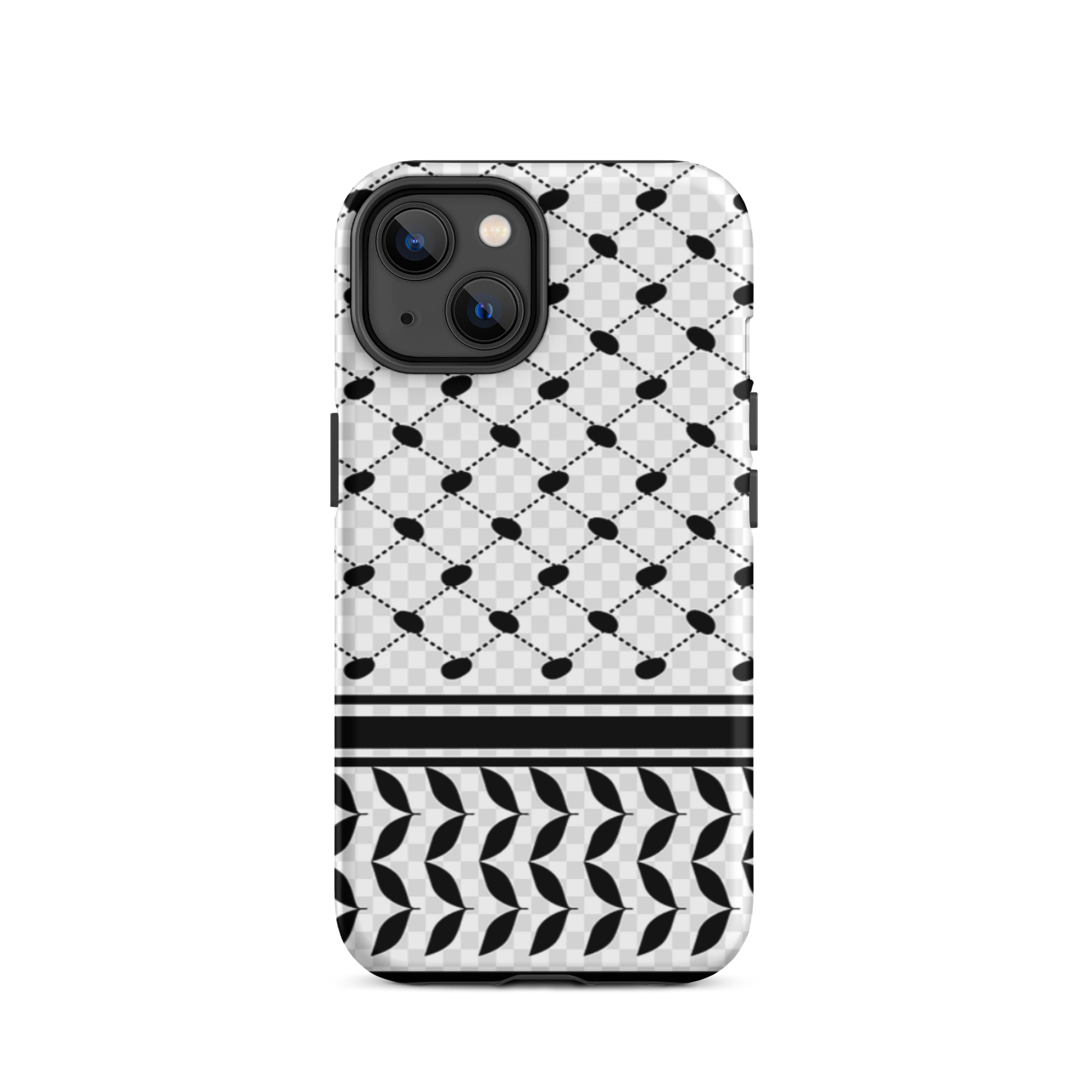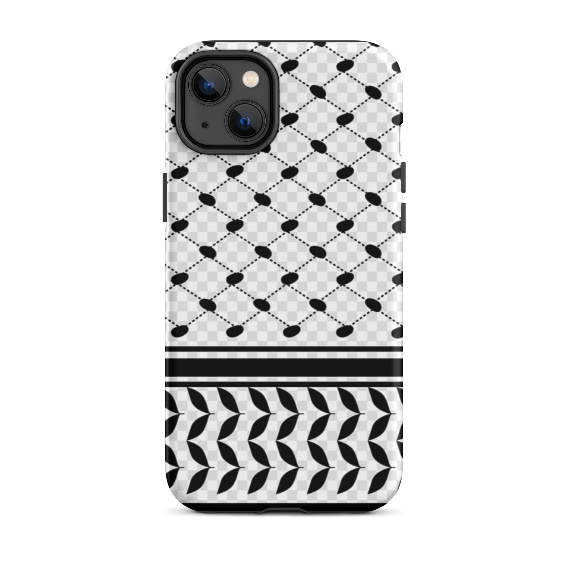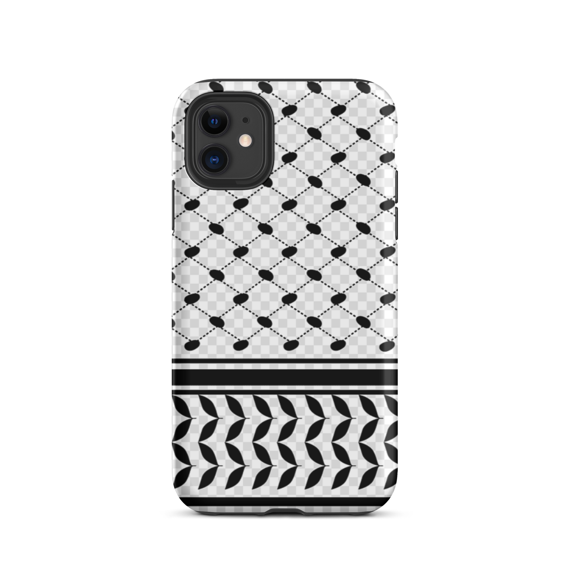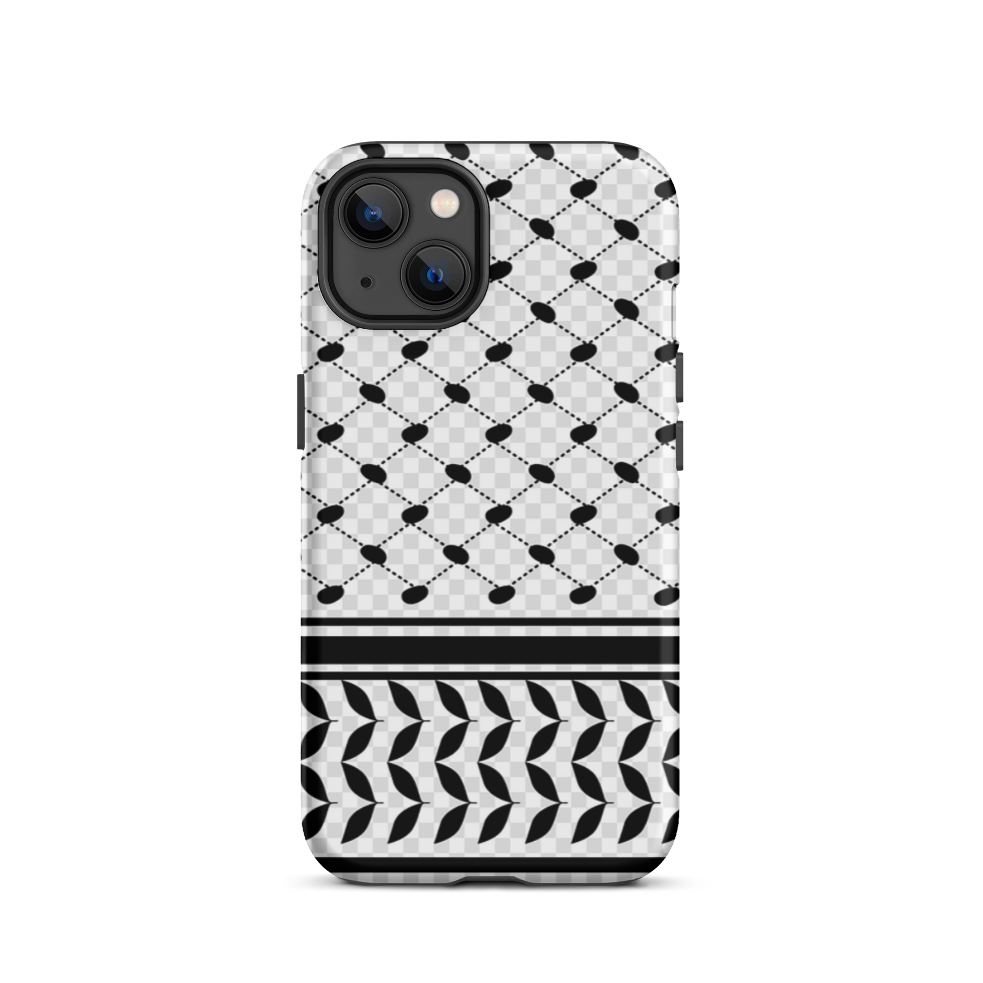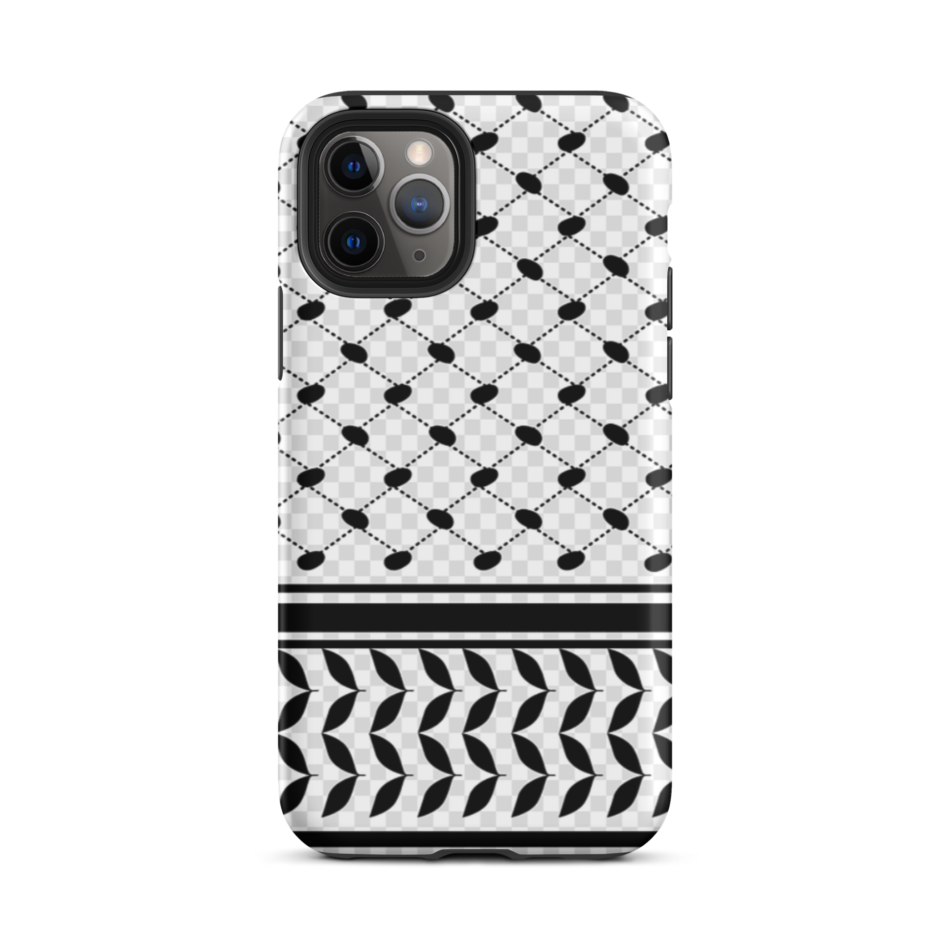 This phone case features a striking design inspired by the traditional Palestinian keffiyeh. The iconic black and white pattern, symbolizing resistance and cultural pride, is intricately woven into the fabric of the case, creating a bold and meaningful statement.