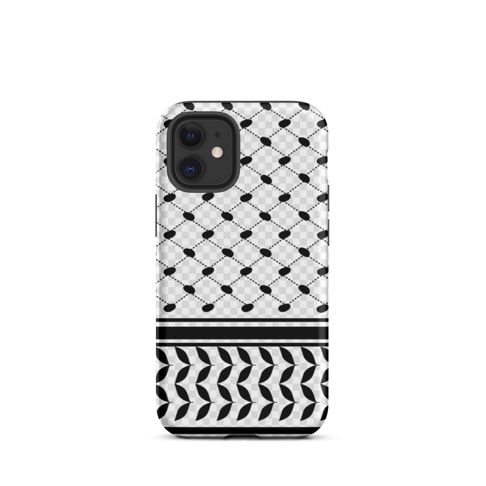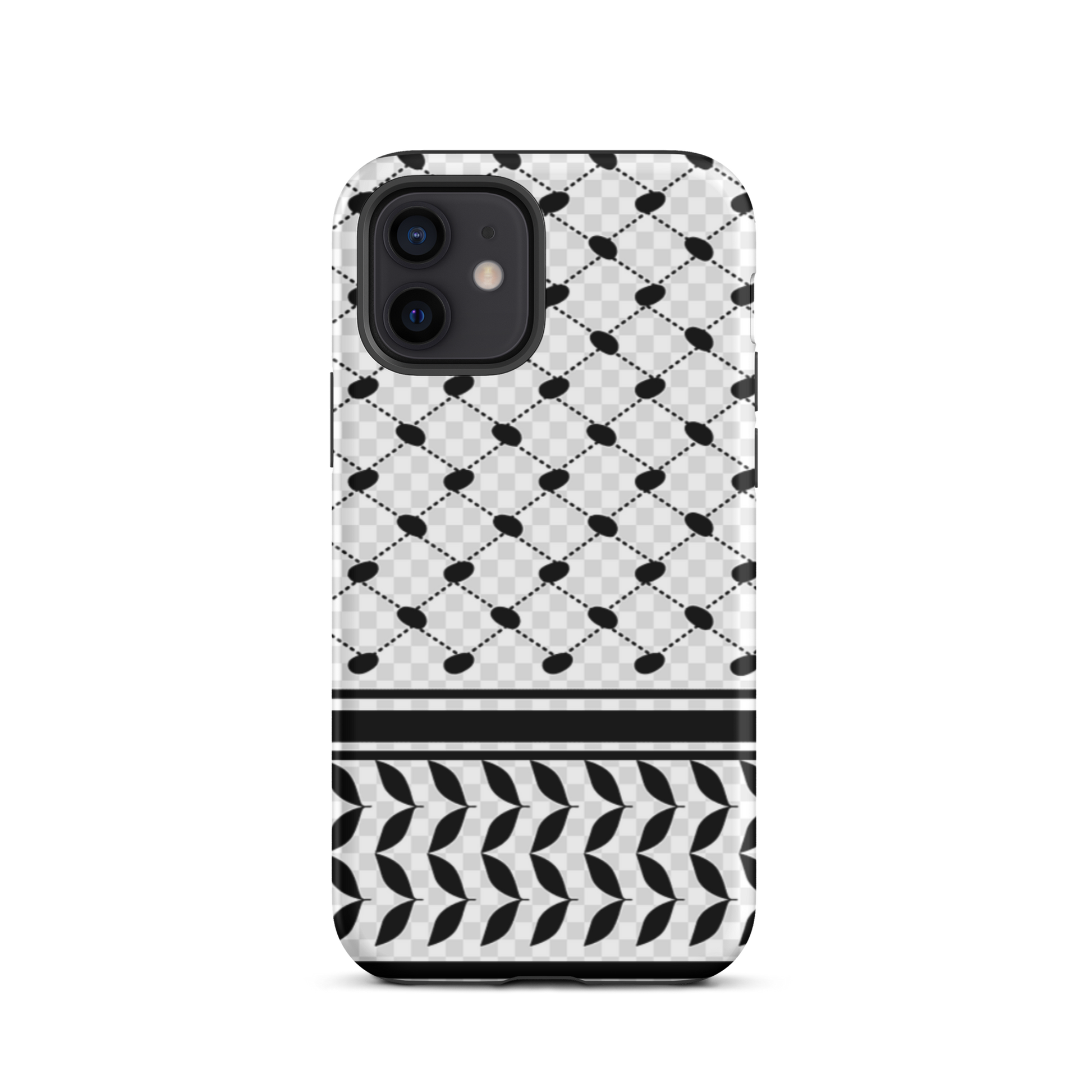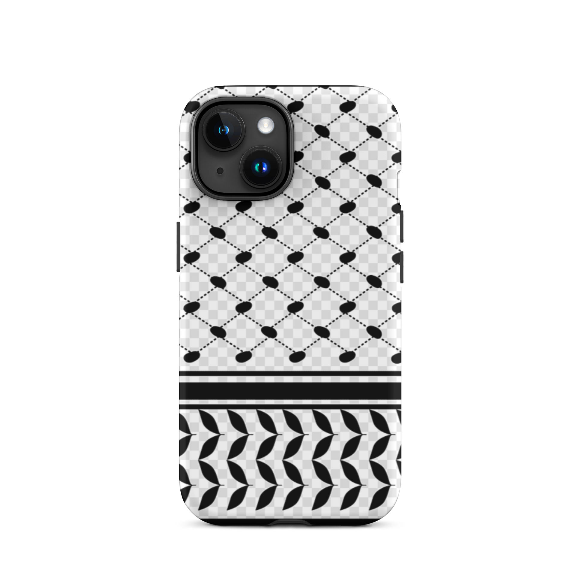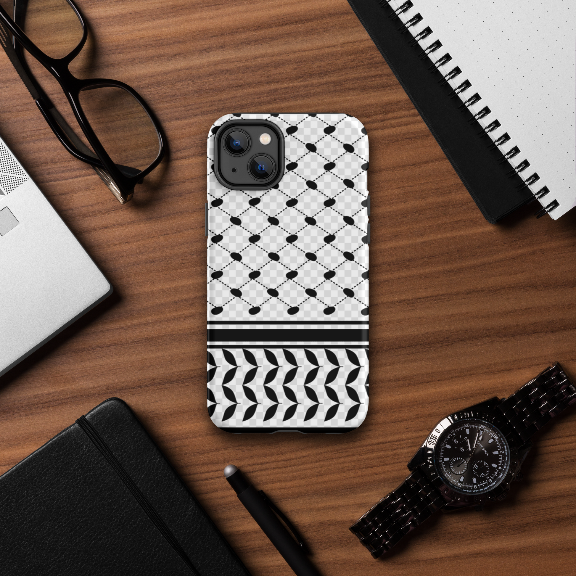 This phone case features a striking design inspired by the traditional Palestinian keffiyeh. The iconic black and white pattern, symbolizing resistance and cultural pride, is intricately woven into the fabric of the case, creating a bold and meaningful statement.