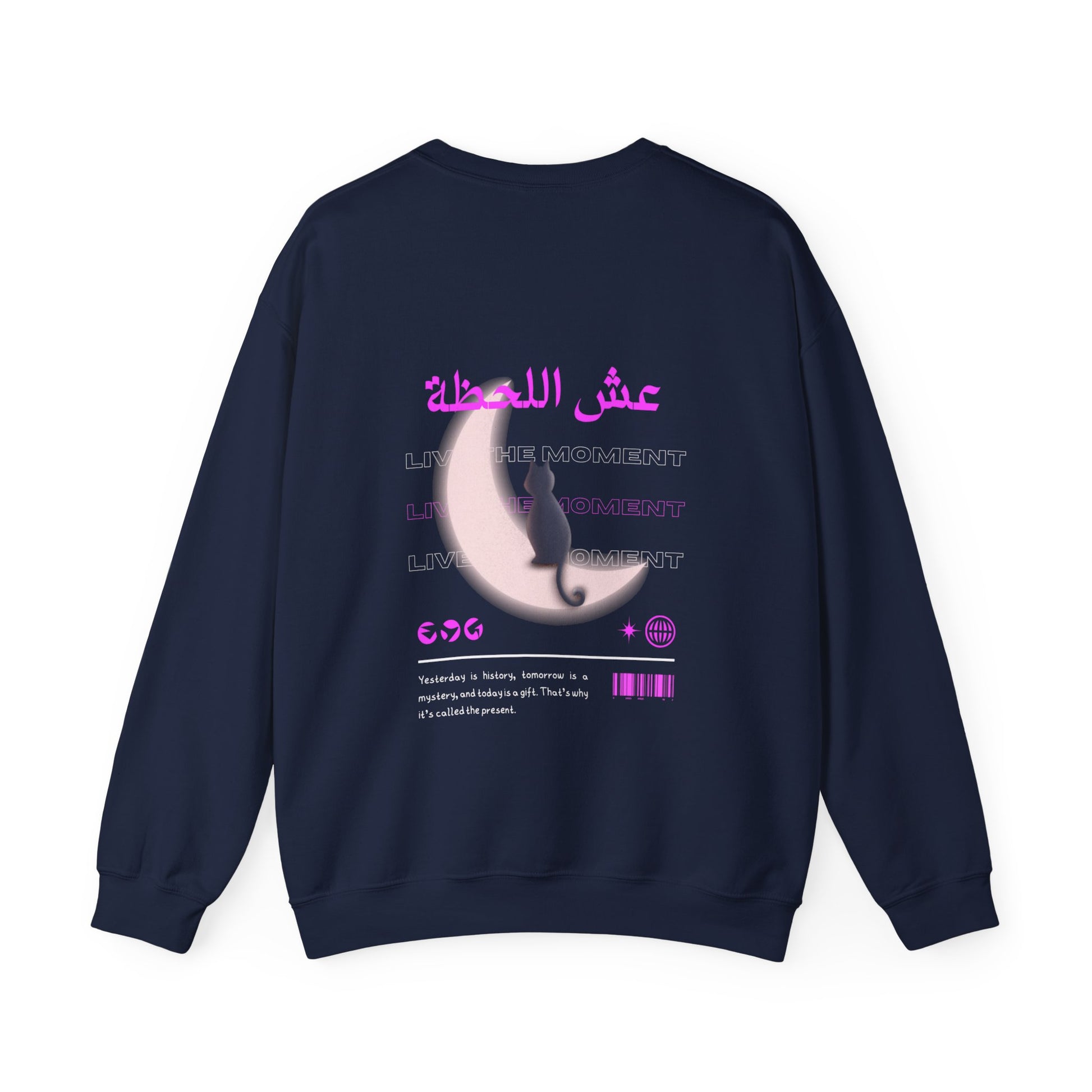 Embrace the beauty of the present with our uniquely designed sweatshirt featuring the inspirational quotes "عش اللحظة" (translated: "Live the Moment") and "Live the Moment." This stylish sweatshirt blends Arabic and English to convey a universal message of mindfulness and appreciation for the here and now. The elegant script and thoughtful design make it a perfect addition to any wardrobe.