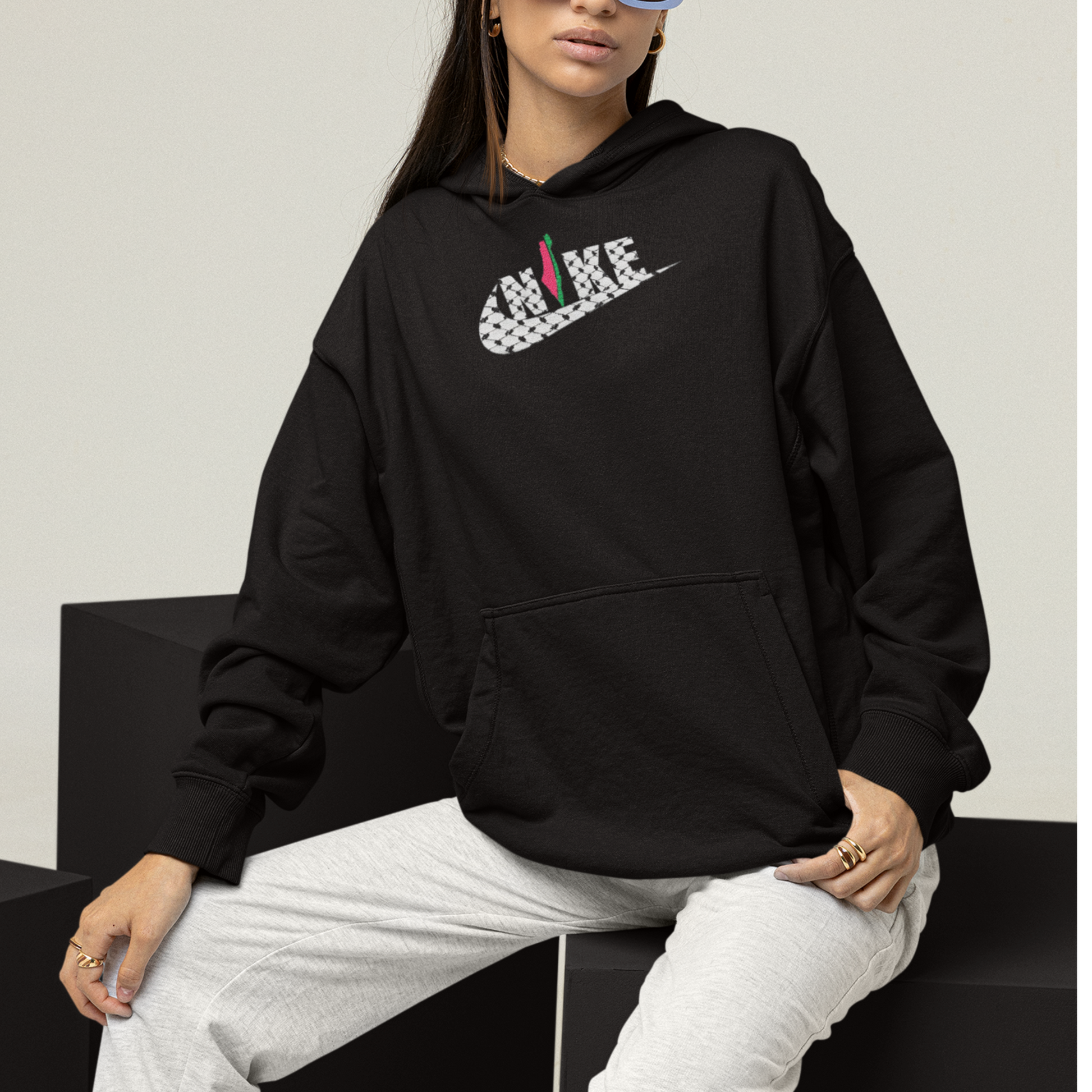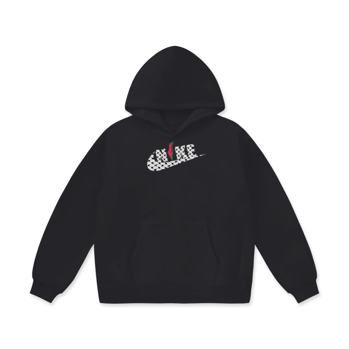 The swoosh is intricately designed with the traditional Palestinian kufiya pattern, symbolizing heritage and strength. To add a vibrant touch, the watermelon detail subtly incorporated into the design stands as a symbol of resilience and freedom. Crafted from premium fabric for ultimate comfort, this hoodie blends cultural pride with streetwear fashion. Perfect for making a statement wherever you go."