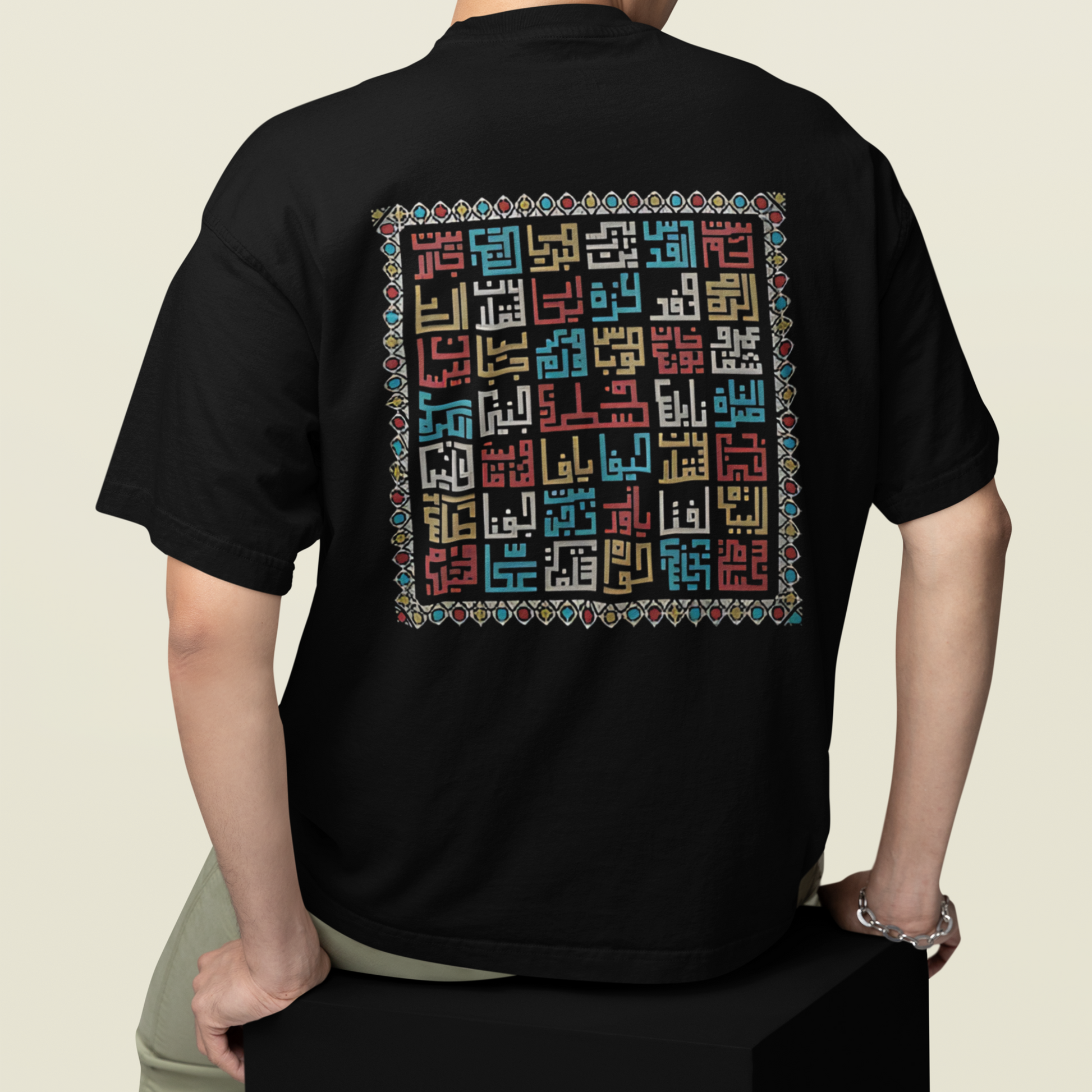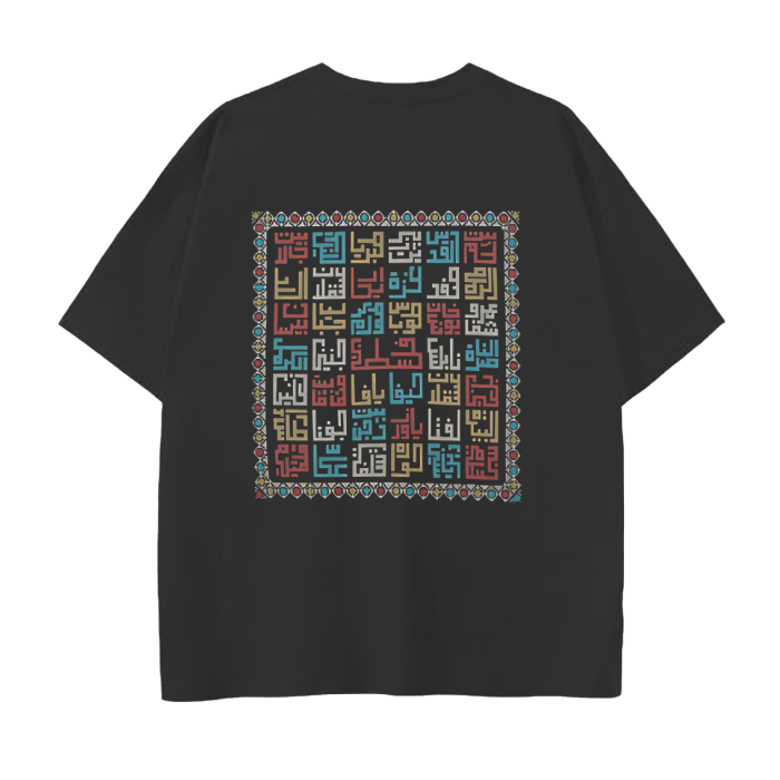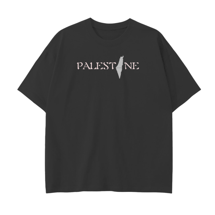 This oversized T-shirt is a statement piece that combines comfort with cultural significance. Made from soft, breathable cotton, it features a relaxed fit that drapes effortlessly, offering both style and ease. The back of the shirt is adorned with a bold, graphic design that lists the names of prominent Palestinian cities in a modern, artistic font. Each city's name is carefully placed, creating a visually striking pattern that celebrates the rich history and vibrant culture of Palestine.