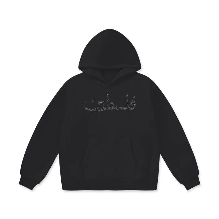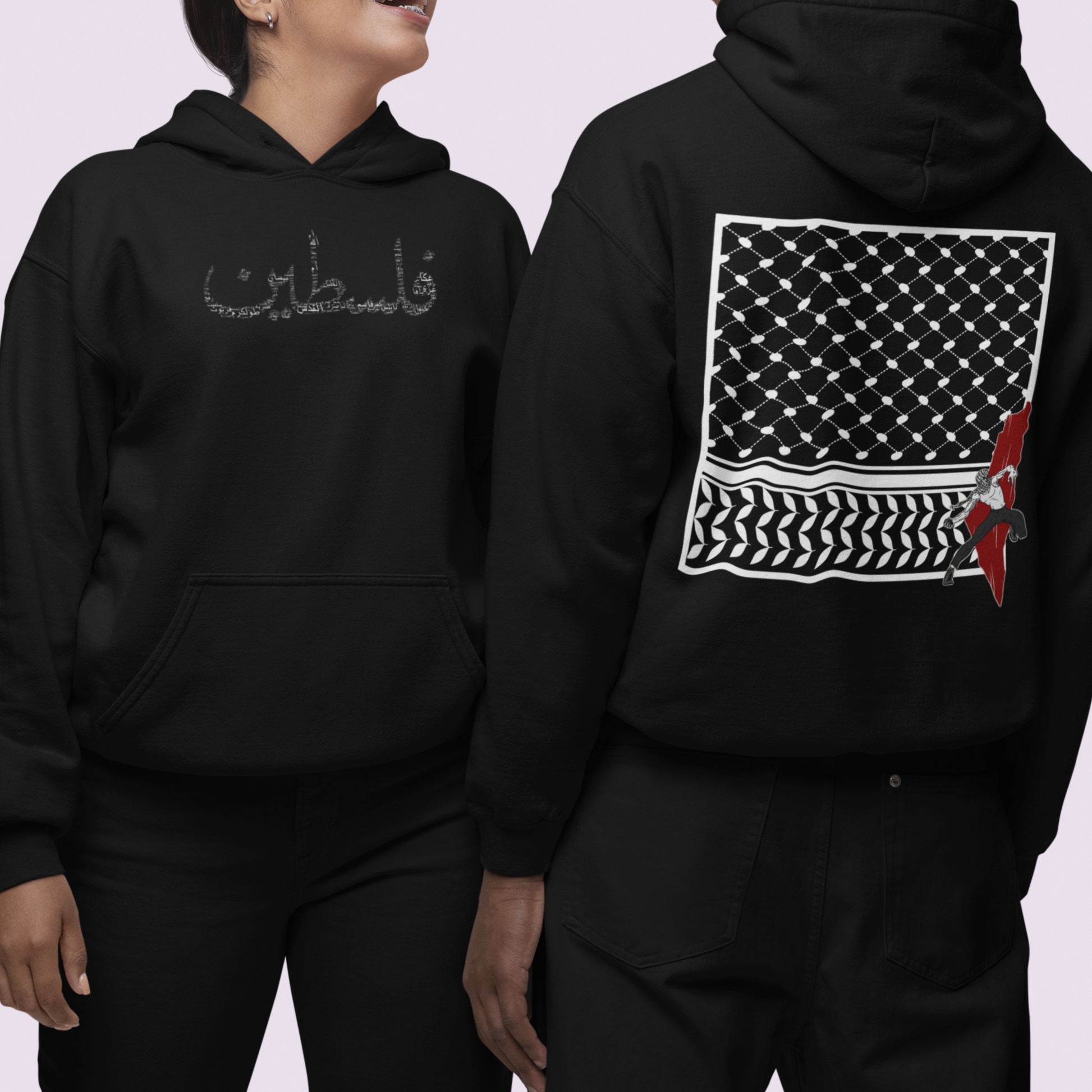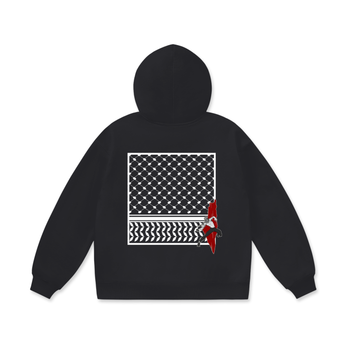 Step out in style and show your support with this unique oversized hoodie. Featuring the iconic kuffieh pattern printed on the back, this hoodie pays homage to Palestinian culture and heritage. On the front, the word "فلسطين" (Palestine) is boldly displayed in elegant Arabic calligraphy.