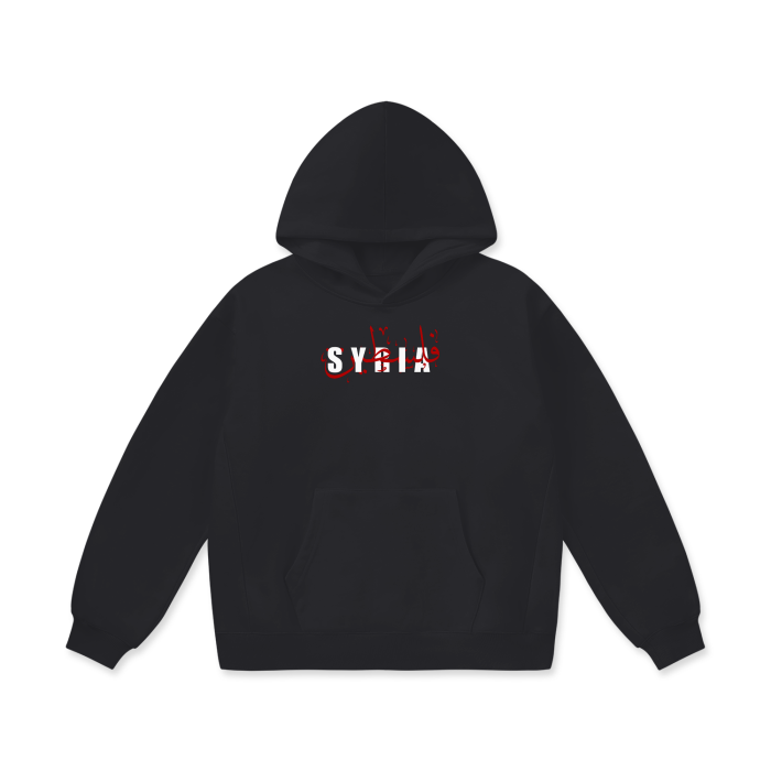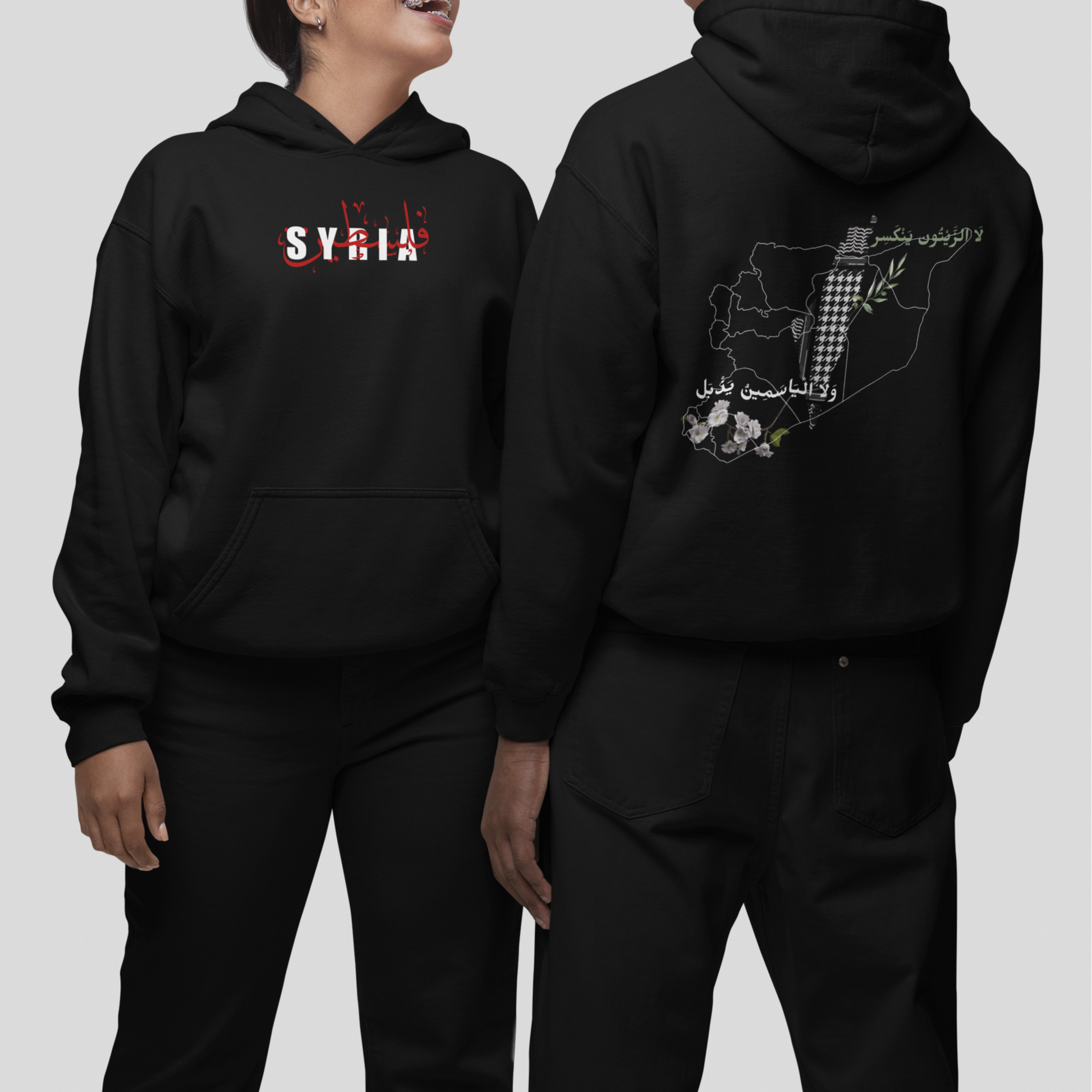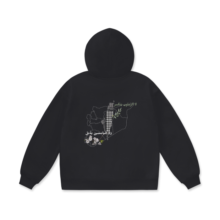 Step into a statement of unity and resilience with our Oversized Hoodie, designed to honor the enduring spirit of Syria and Palestine. On the front, the words "Syria" and "Palestine" are artistically connected, symbolizing solidarity and shared strength. The back features the Syria chart and the Palestinian chart, side by side, as a powerful tribute to the courage and hope of these nations.