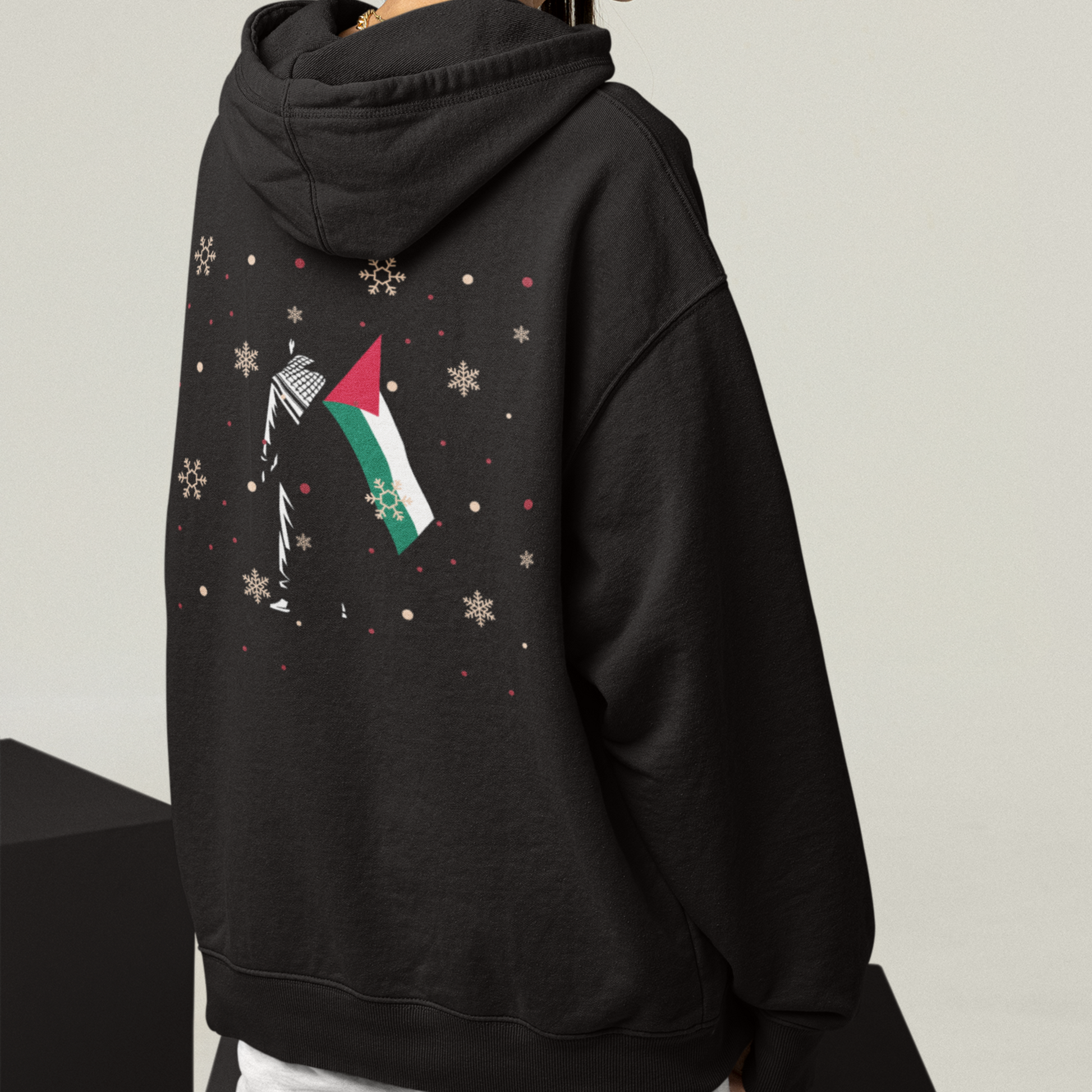 Celebrate the holiday season with a bold statement of resilience and hope. Our "Winter of Freedom Hoodie" showcases a striking design of a man proudly holding the Palestinian flag, set against a serene backdrop of Christmas snow. This unique blend of festive spirit and unwavering solidarity makes it the perfect choice for those who wish to wear their values with pride.