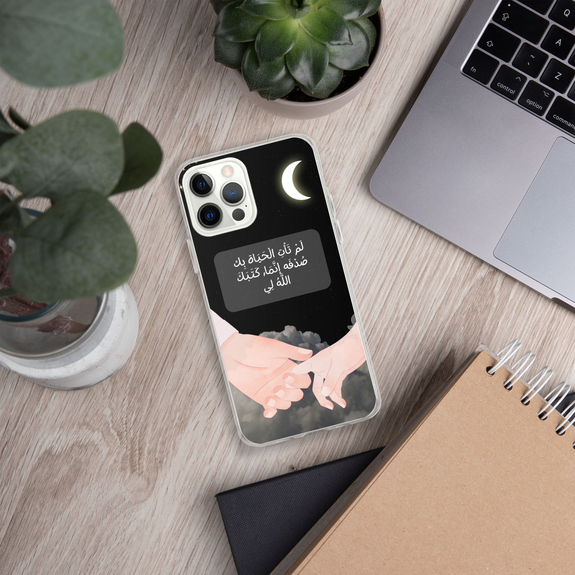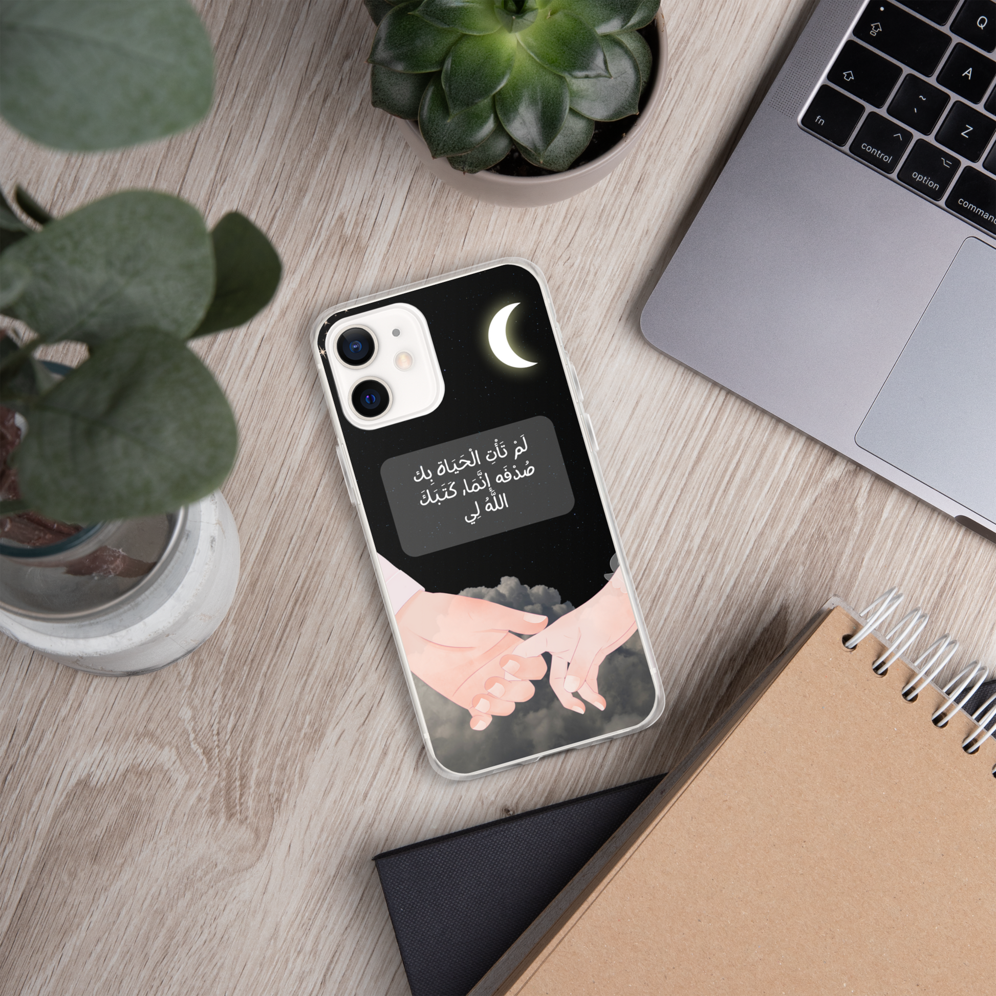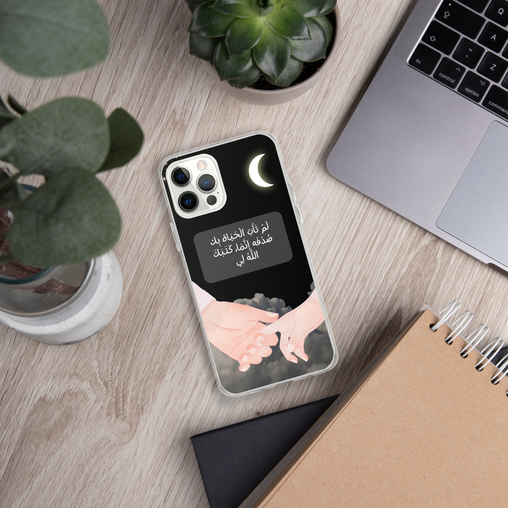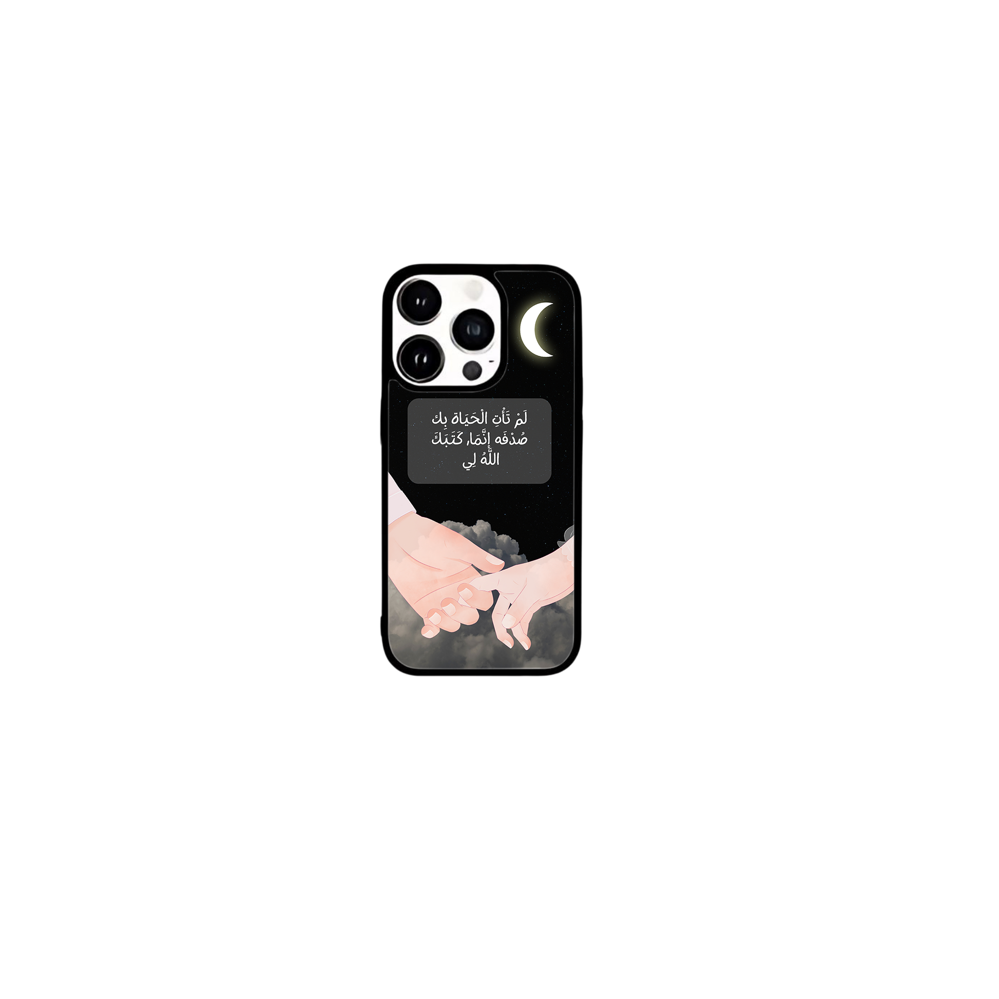 This iPhone case features a beautifully crafted couple design that symbolizes love and unity. In the center of the case, elegantly written in Arabic calligraphy, are the words لَمْ تَأْتِ الْحَيَاة بِك صُدْفَه إنَّمَا, كَتَبَكَ اللَّهُ لِي which translates to "You did not come into my life by chance; God wrote you for me." The design captures the essence of destiny and the special bond between two people. The case is made from durable materials, offering both protection and style, making it a perfect gift for a loved one or a meaningful way to express your affection.