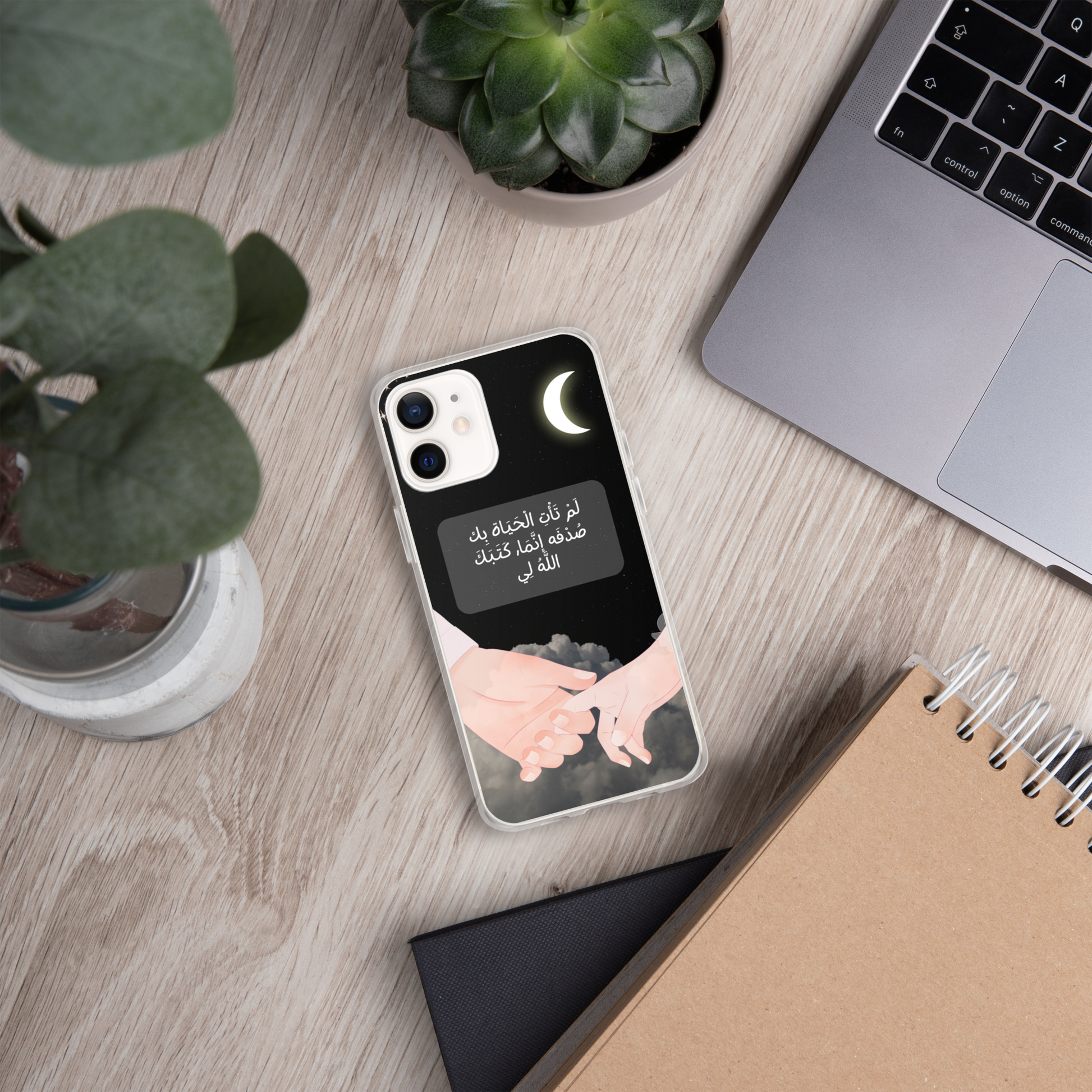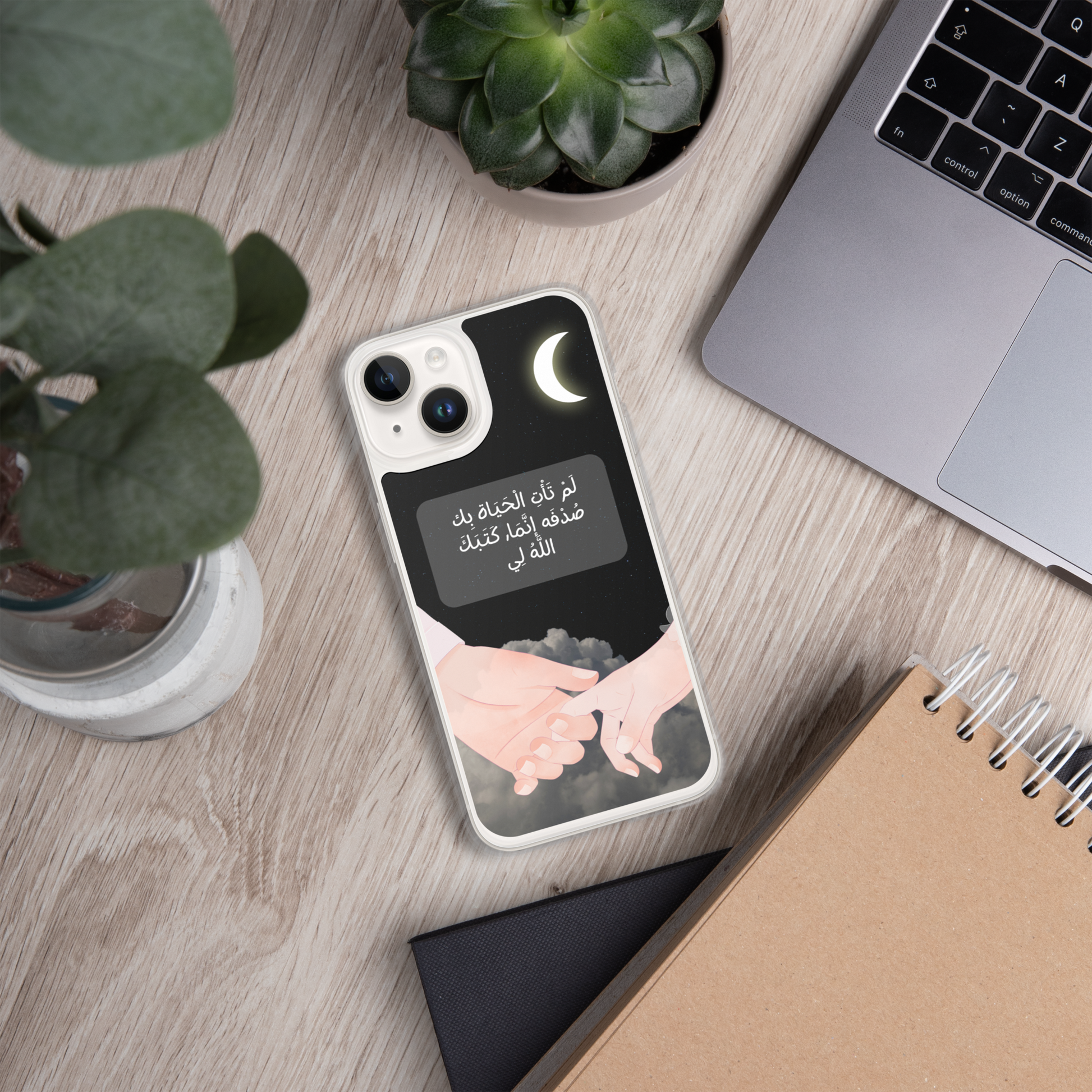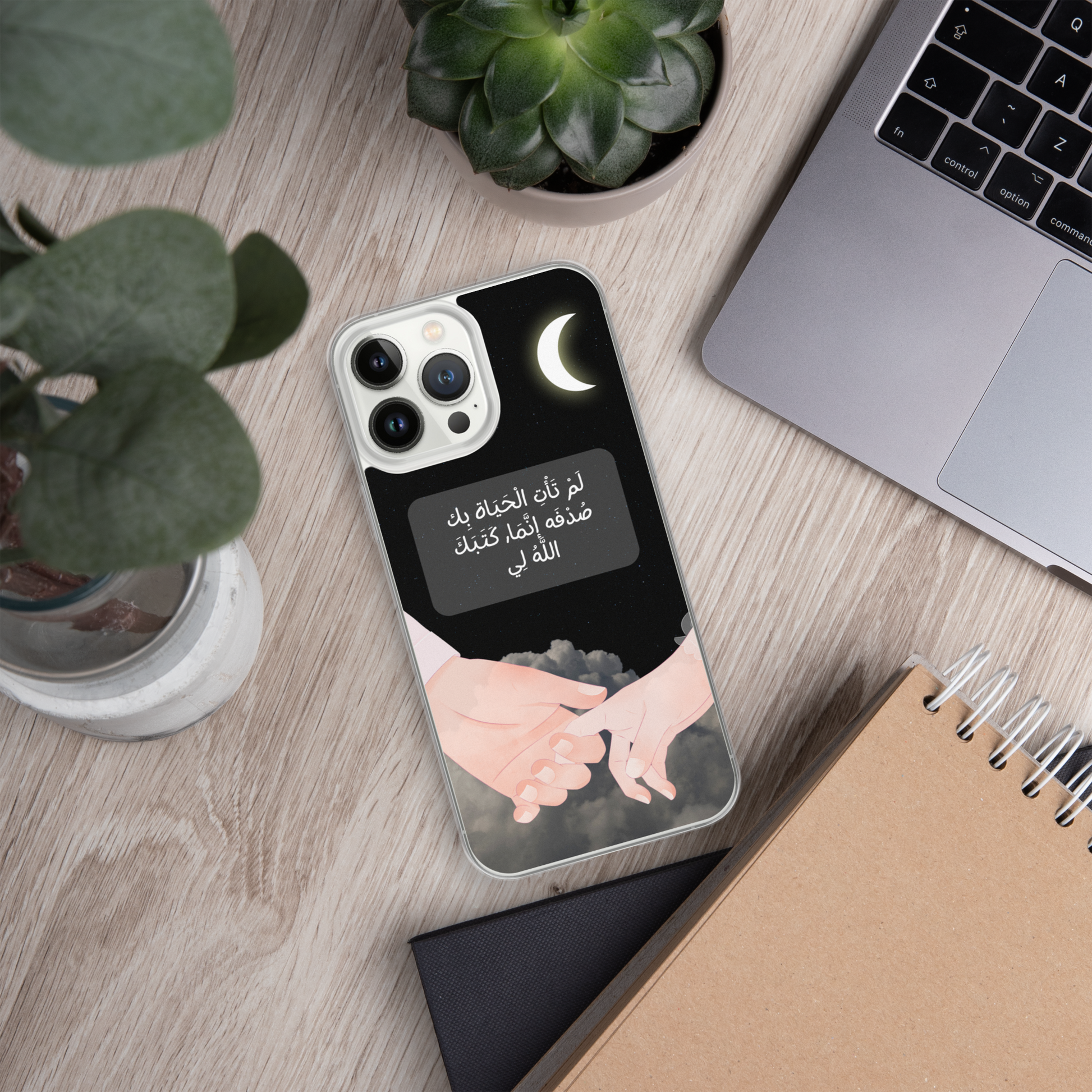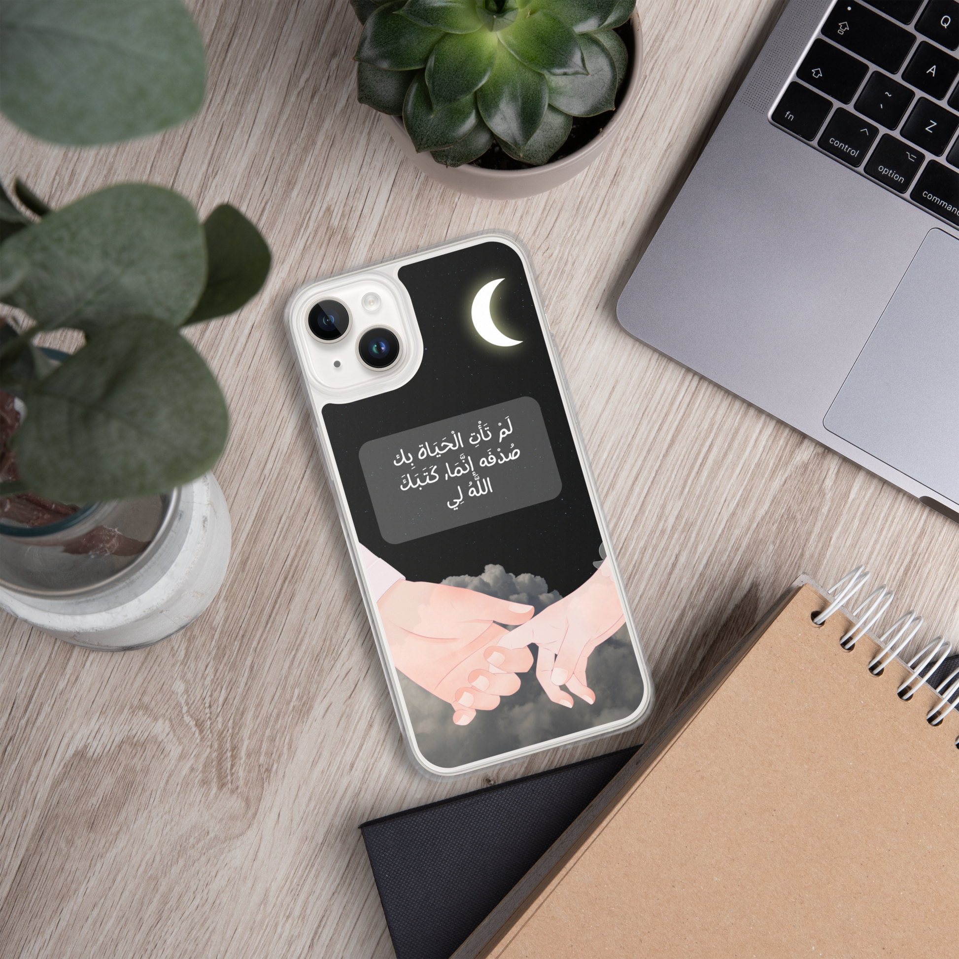 This iPhone case features a beautifully crafted couple design that symbolizes love and unity. In the center of the case, elegantly written in Arabic calligraphy, are the words لَمْ تَأْتِ الْحَيَاة بِك صُدْفَه إنَّمَا, كَتَبَكَ اللَّهُ لِي which translates to "You did not come into my life by chance; God wrote you for me." The design captures the essence of destiny and the special bond between two people. The case is made from durable materials, offering both protection and style, making it a perfect gift for a loved one or a meaningful way to express your affection.
