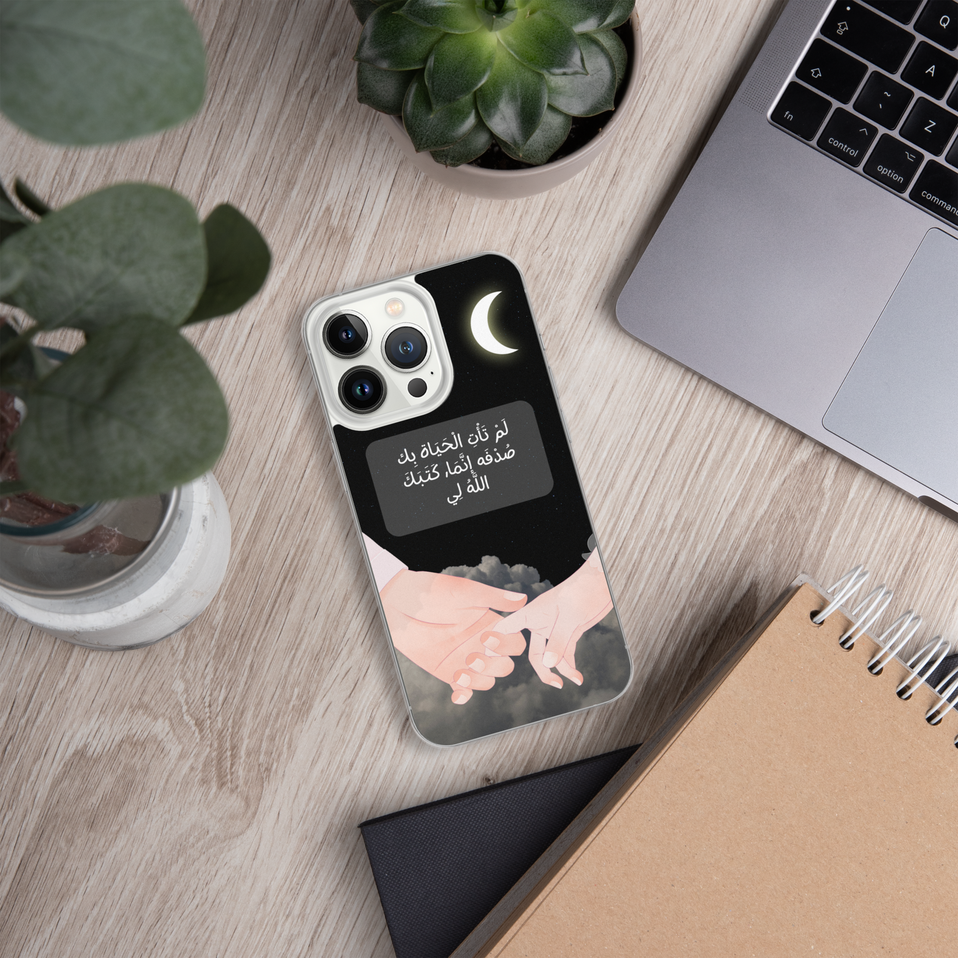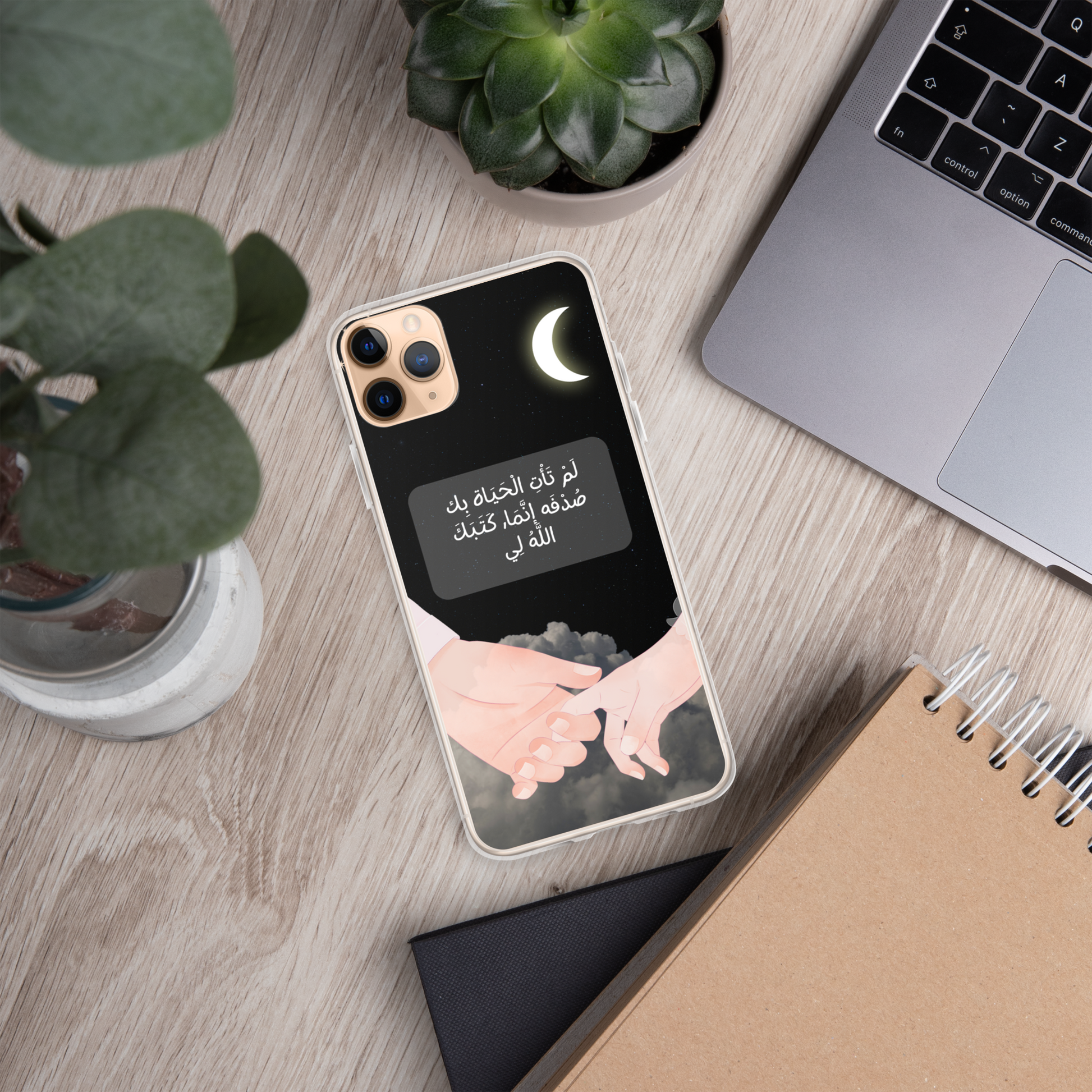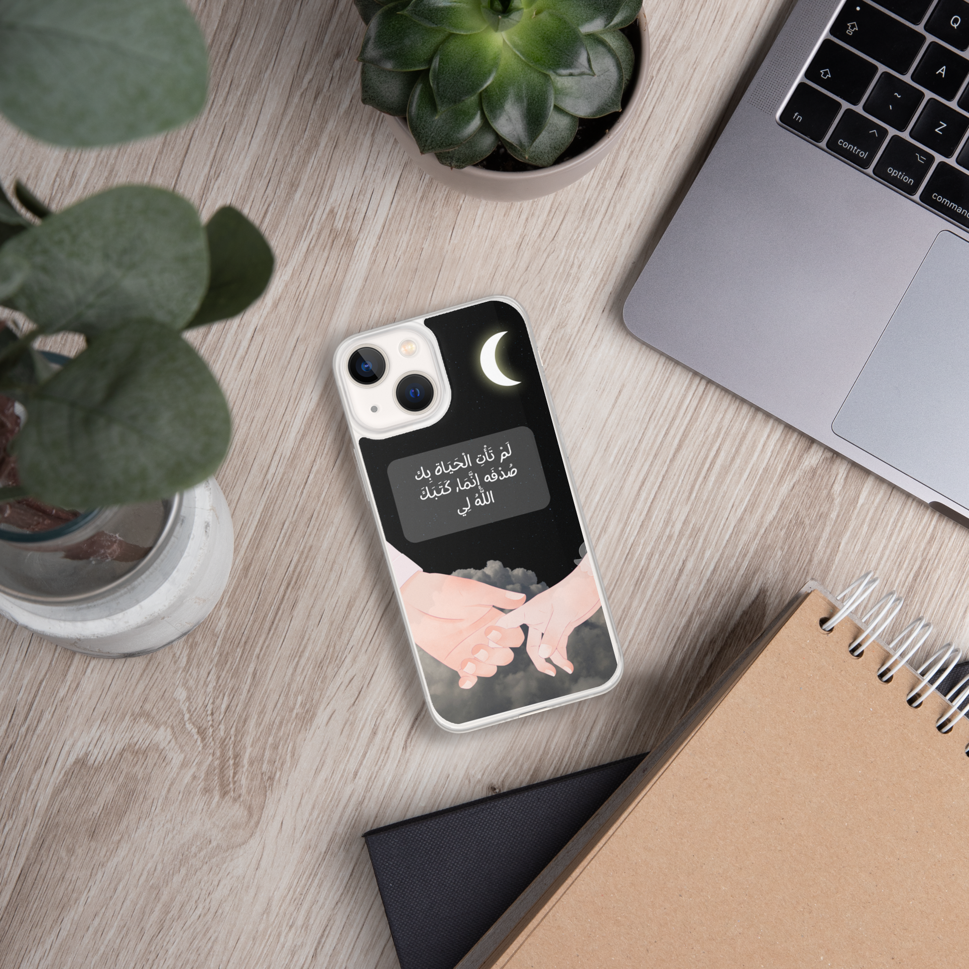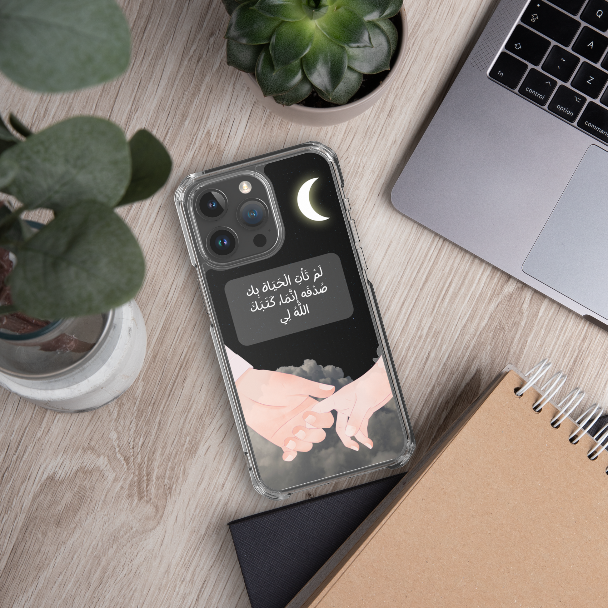 This iPhone case features a beautifully crafted couple design that symbolizes love and unity. In the center of the case, elegantly written in Arabic calligraphy, are the words لَمْ تَأْتِ الْحَيَاة بِك صُدْفَه إنَّمَا, كَتَبَكَ اللَّهُ لِي which translates to "You did not come into my life by chance; God wrote you for me." The design captures the essence of destiny and the special bond between two people. The case is made from durable materials, offering both protection and style, making it a perfect gift for a loved one or a meaningful way to express your affection.