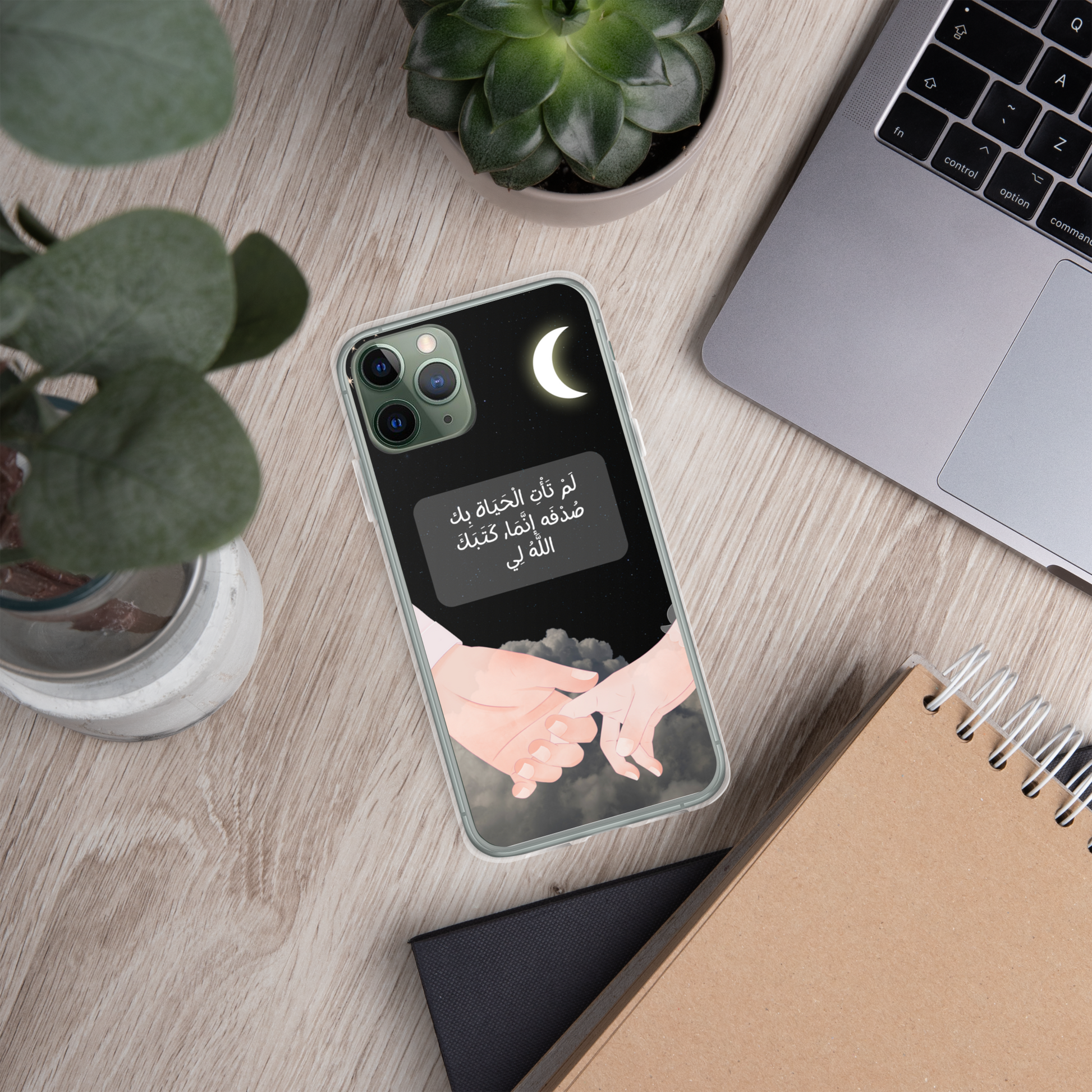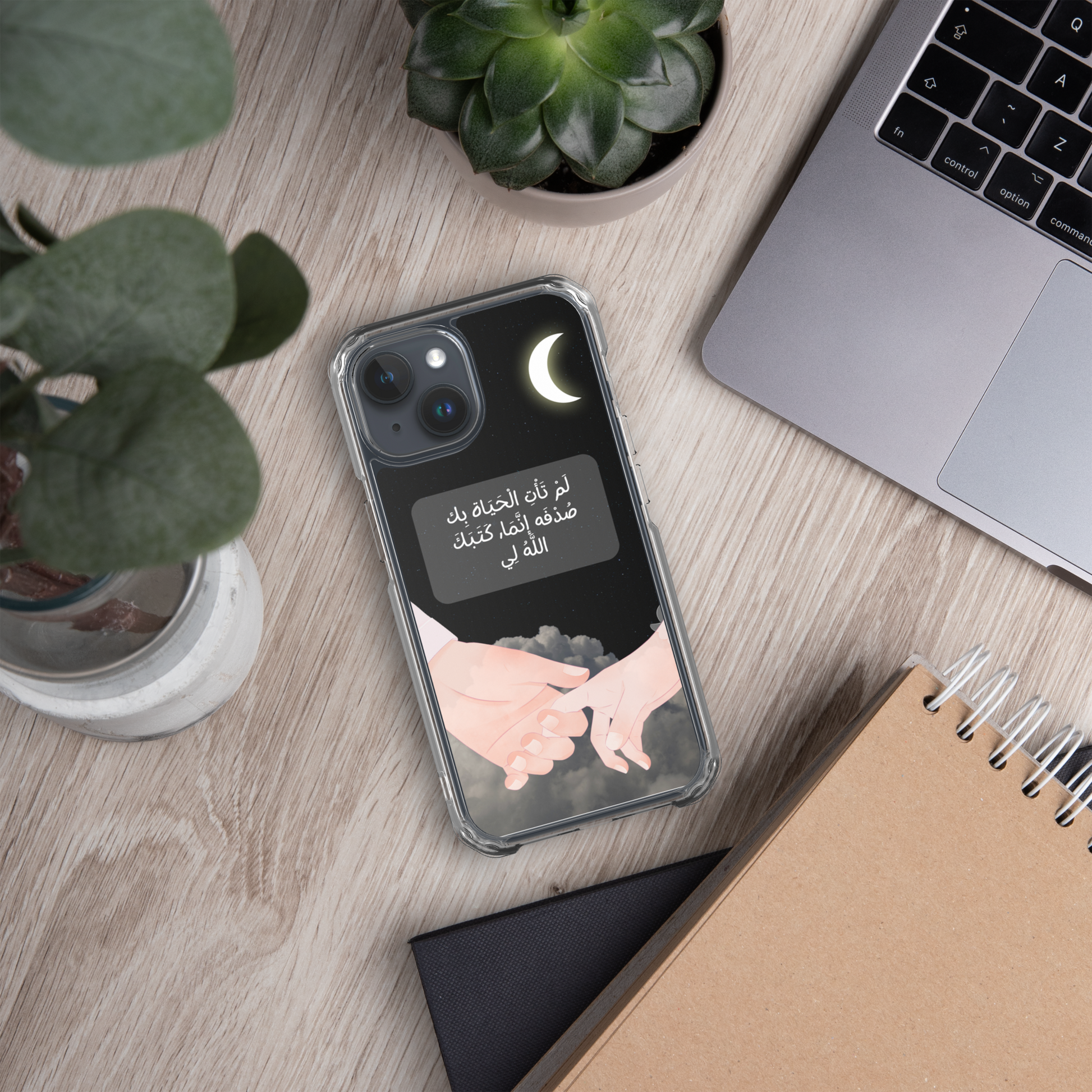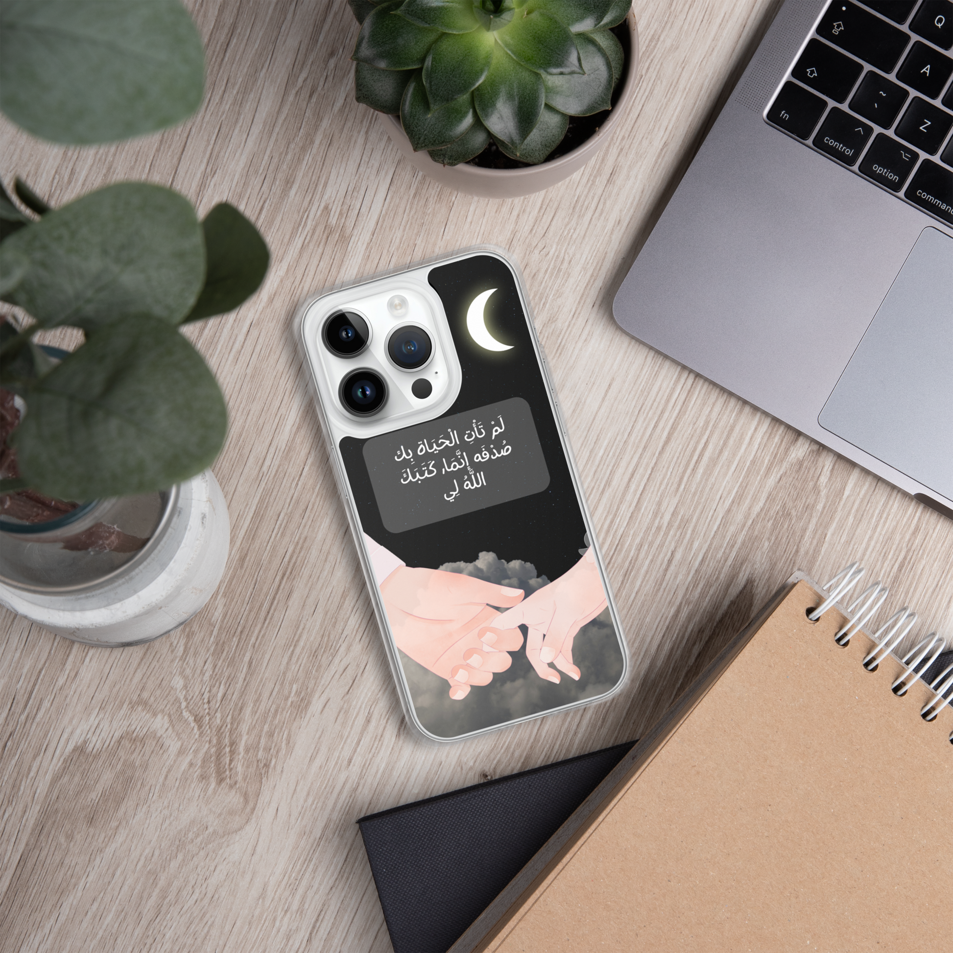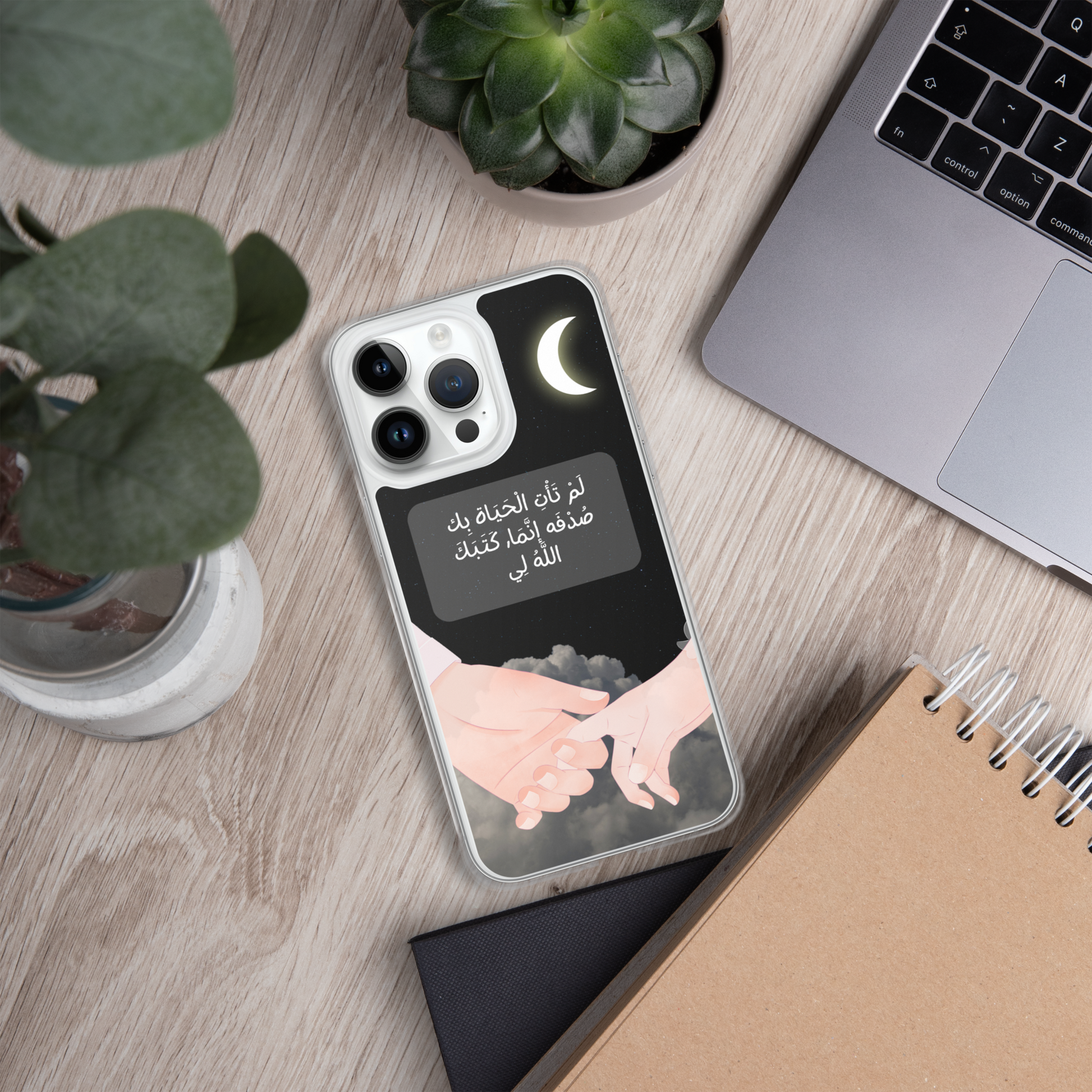 This iPhone case features a beautifully crafted couple design that symbolizes love and unity. In the center of the case, elegantly written in Arabic calligraphy, are the words لَمْ تَأْتِ الْحَيَاة بِك صُدْفَه إنَّمَا, كَتَبَكَ اللَّهُ لِي which translates to "You did not come into my life by chance; God wrote you for me." The design captures the essence of destiny and the special bond between two people. The case is made from durable materials, offering both protection and style, making it a perfect gift for a loved one or a meaningful way to express your affection.